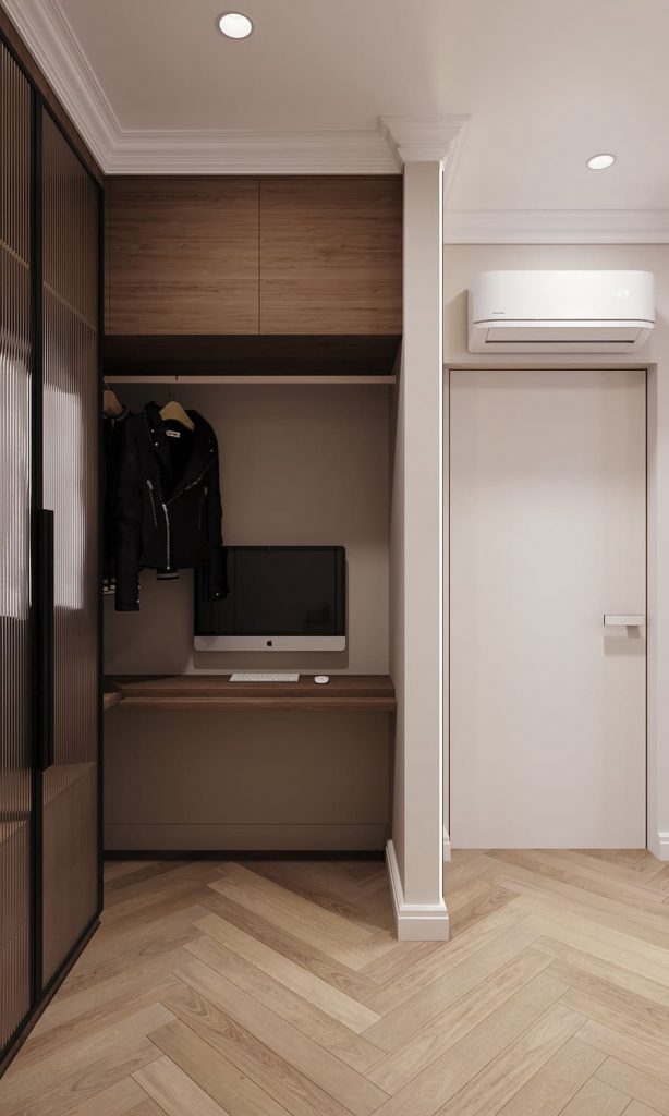 В глубине спальни расположена удобная гардеробная — с полупрозрачными дверцами и встроенным освещением. Здесь также оборудовано небольшое рабочее место, уместно встроенное в нишу, чтобы не перегружать спальню лишними элементами.