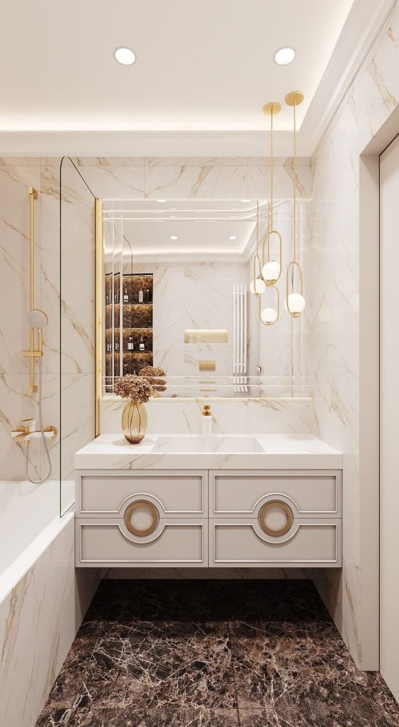 Подвесная тумба с округлыми декоративными элементами и латунными вставками поддерживает классический мотив в современной обработке. Подсветка в нишах и зеркало во весь рост создают мягкое освещение и делают пространство более воздушным. Вся сантехника — в цвете тёплого золота.