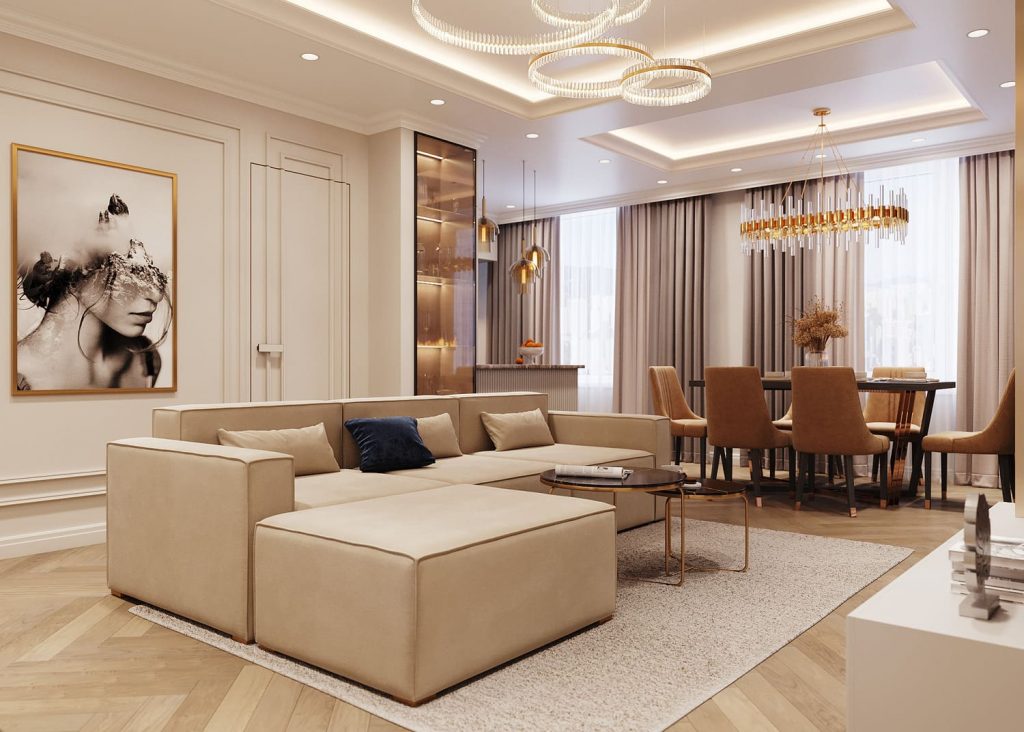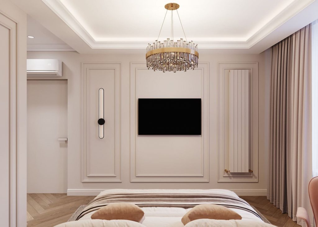 Потолок с подсветкой по периметру и крупная люстра с хрустальными подвесками продолжают эстетику современной классики. Стены украшены симметричными молдингами, которые визуально выравнивают пропорции комнаты и создают ощущение порядка. Цветовая палитра — сдержанная, в бежевых и пудровых тонах, с мягкими контрастами: это даёт глазу отдых, но не делает интерьер скучным.