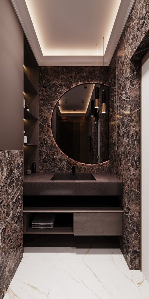 Глубокие оттенки коричневого мрамора с выразительным белым прожилом задают тон всему пространству. Их поддерживает крупноформатная плитка под светлый мрамор на полу и акцентная золотая плитка в душевой зоне, создающая ощущение тепла и благородства.