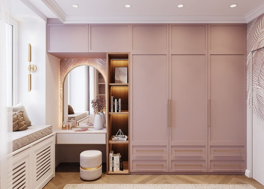 Центр спальни — это кровать с мягким изголовьем на фоне изысканной декоративной панели, где светлый текстиль обрамлён золотыми диагональными линиями и акцентной вставкой под мрамор. Этот фон делает композицию торжественной, но не перегруженной. Слева — изящная консоль и розовое кресло, образующие компактную бьюти-зону, дополненную зеркалом с подсветкой.