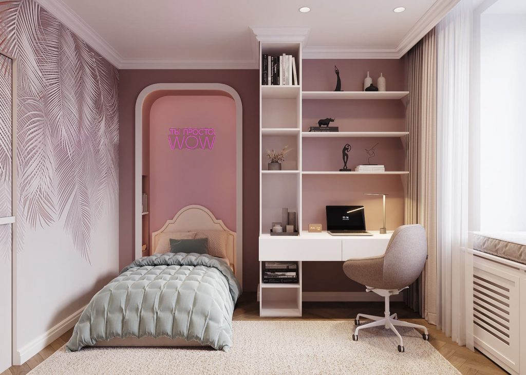 У окна устроен сидячий подоконник — любимое место хозяйки для чтения, размышлений и просто отдыха. Рядом — полноценная рабочая зона с большим столом, встроенными полками и удобным креслом, где комфортно заниматься учёбой и творчеством. Акцентная фраза «Ты просто WOW» в мягкой неоновой подсветке на фоне арки — тонкий намёк на уверенность и индивидуальность, которую важно поддерживать в подростковом возрасте.