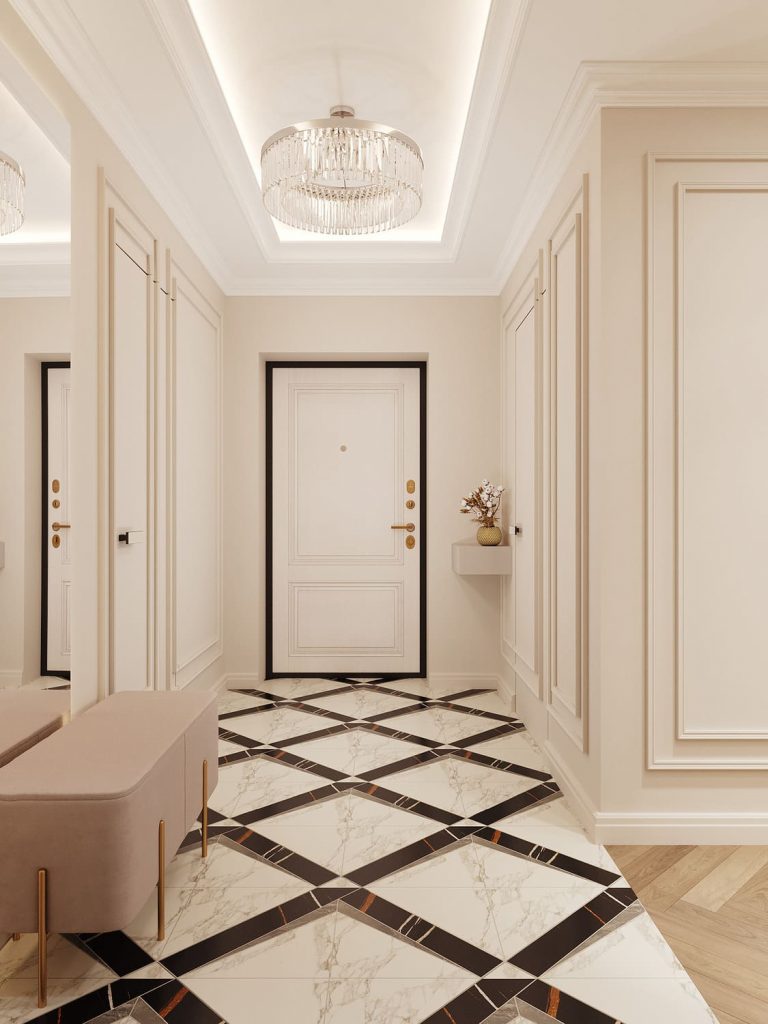 Эффектная напольная плитка с рисунком под мрамор и чётким тёмным кантом задаёт ритм и придаёт помещению графичность. Потолок с мягкой подсветкой по периметру и хрустальной люстрой добавляет нотку торжественности. Лаконичная консоль с декоративной вазой делает пространство у входа не только функциональным, но и уютным.