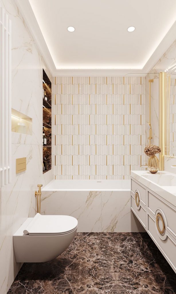 Интерьер выдержан в светлой, элегантной гамме с акцентом на белый мрамор с золотыми прожилками. Стены отделаны крупноформатным керамогранитом и декоративной плиткой с геометрическим рисунком, которая подчёркивает зону ванны. На контрасте — тёмный мраморный пол, добавляющий глубины и визуального веса.