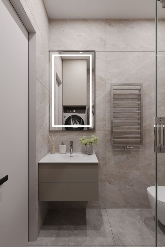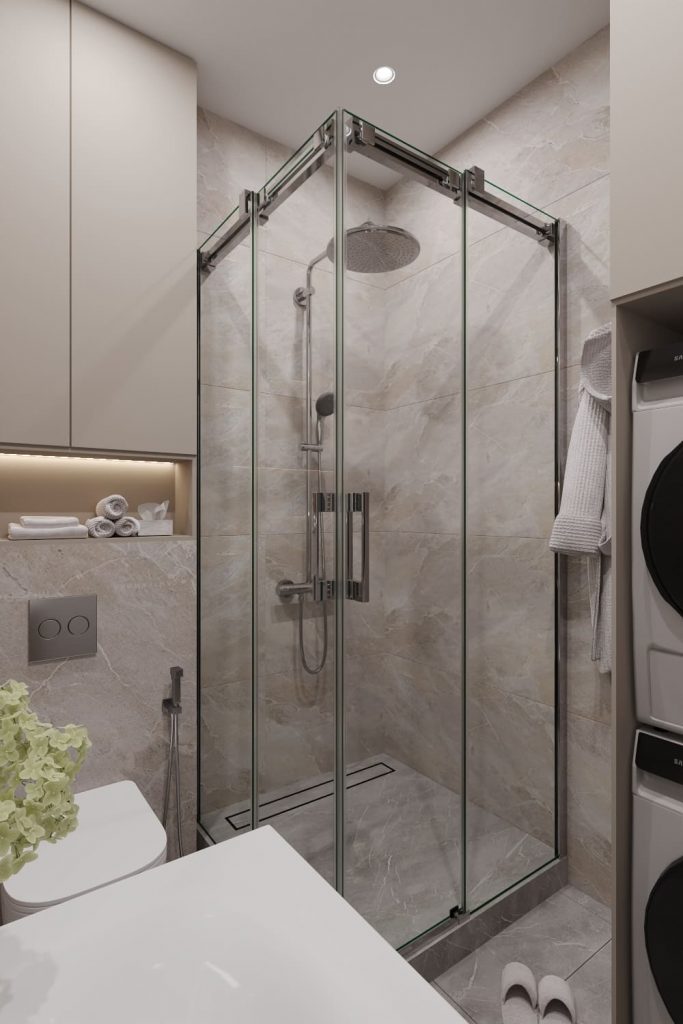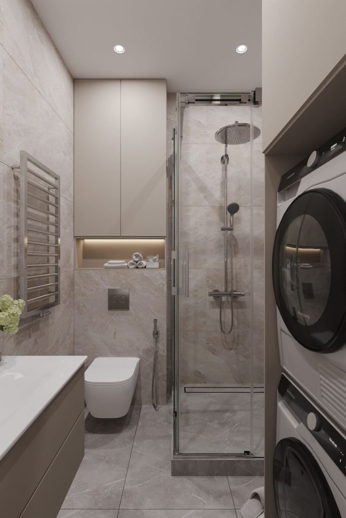 Душевая - комфортная и функциональная. Здесь - компактная душевая кабина за стеклянными дверью и перегородкой; раковина с подвесной тумбой и зеркалом с подсветкой над ней; встроенные стиральная и сушильная машины, размещенные тут по пожеланию заказчика; подвесной унитаз с гигиеническим душем. Для большего удобства здесь размещены полотенцесушитель и сделана полка-ниша над унитазом для полотенец и ароматизаторов. Исполнена душевая в основной бежево-кофейной нюдовой гамме.