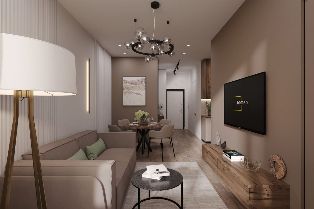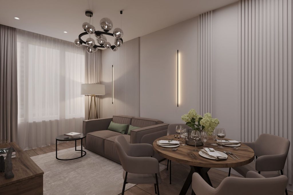 Современная вартира в нюдовой гамме с деревянными элементами