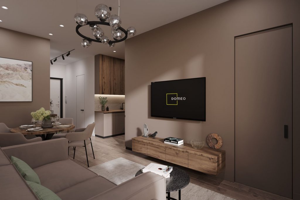 Оформлена кухня-гостиная в очень приятной теплой нюдовой гамме. Основной цвет здесь - бежево-кофейный: стены, дверь в спальню, фасады столов кухни-ниши, обивка мягкой мебели; разбавлен он белым цветом стены за диваном, светлым панно, и деревянной отделкой верхних фасадов кухни, ее столешницы, обеденного стола, ТВ тумбы. Особый антураж добавляют комнате интересные источники освещения в скандинавском стиле - торшер около дивана и люстра.