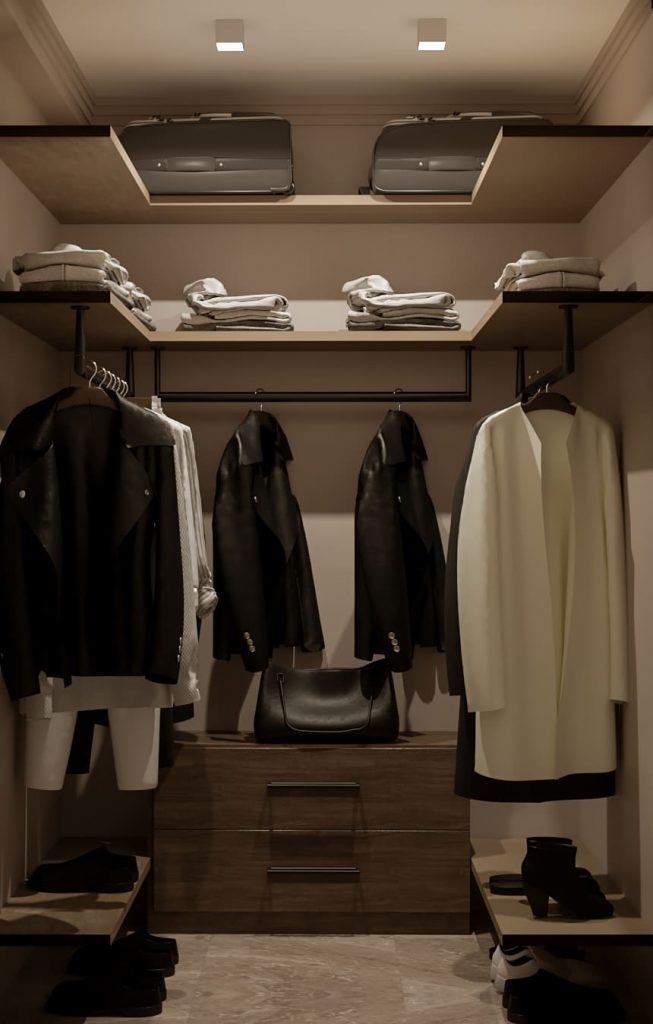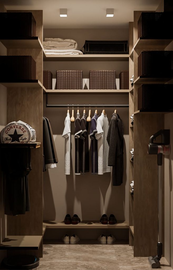 В этой квартире удалось реализовать сразу три полноценные гардеробные — и это стало одной из сильных сторон проекта. Благодаря этому мы полностью отказались от громоздких шкафов, сохранив лёгкость и визуальную чистоту в жилых зонах. Каждое помещение спланировано по индивидуальному сценарию: для верхней одежды, повседневных вещей и хранения бытового. Открытые полки, закрытые ящики, корзины и ниши — всё на своих местах. Тёплое освещение, сдержанные тона и лаконичная отделка делают гардеробные не только практичными, но и эстетичными.