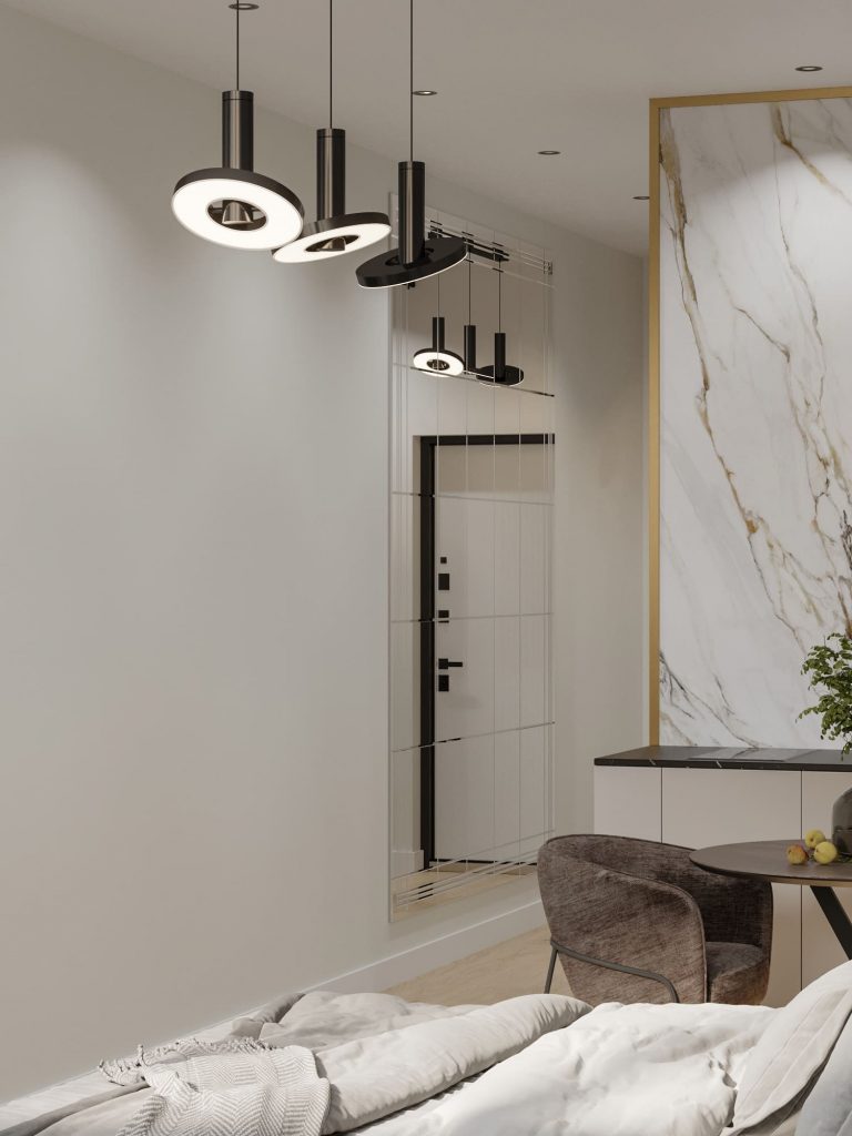 В этой студии кухня и спальня гармонично сливаются в единое пространство, оформленное в светлых тонах. За кроватью выделяются деревянные панели, привнося теплоту и натуральность в интерьер. Темные акценты в виде светильников и картины на стене вносят в комнату динамику и стиль. У маленького круглого столика на кухне расположены темные стулья, создающие контраст с светлым фоном и добавляющие изюминку в дизайн. Напротив кровати установлен телевизор, что делает пространство ещё более функциональным и комфортным как для отдыха, так и для просмотра фильмов. А широкий подоконник превращен в уютное сидячее место, откуда открывается красивый вид и можно насладиться отдыхом с чашечкой кофе.