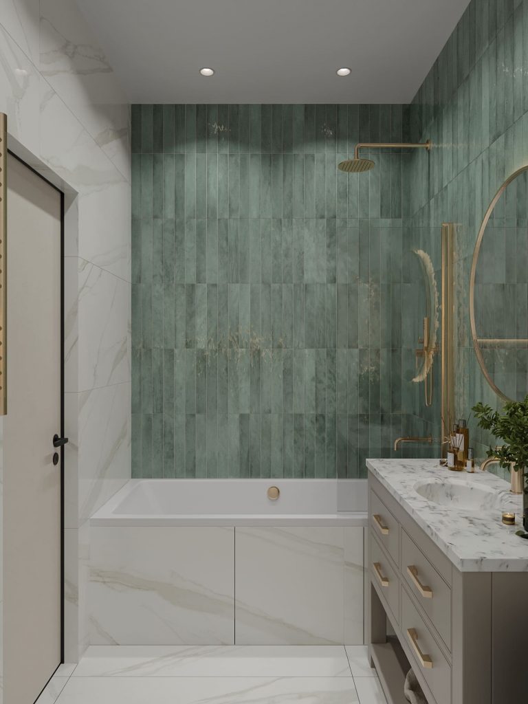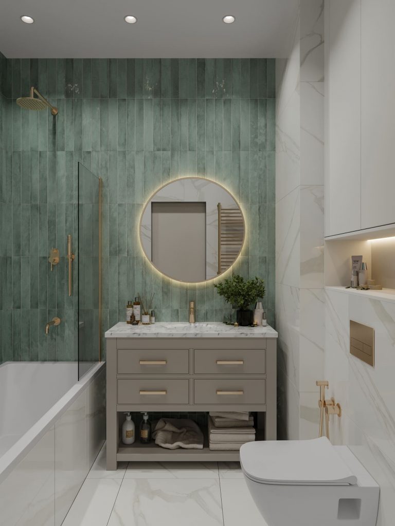 Основой санузла стала светлая палитра и мраморная отделка. Ярким акцентом выступила стена с изумрудной плиткой, которую дополнила золотистая фурнитура.