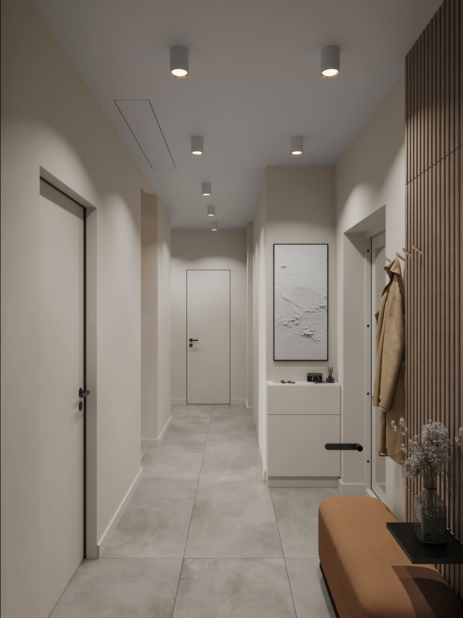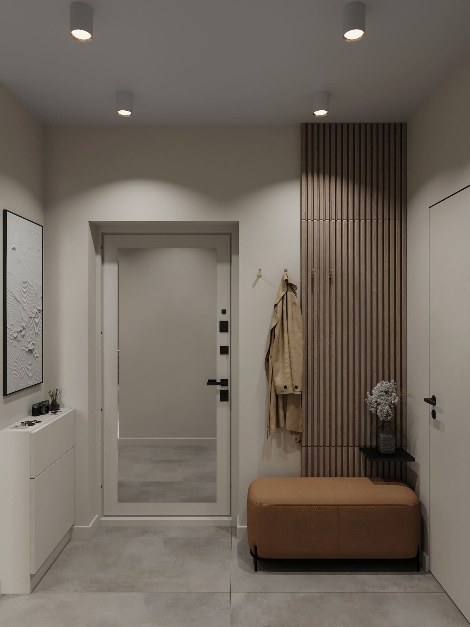 Проект прихожей создан в современном стиле с акцентами скандинавского дизайна и минимализма. Основой стала нейтральная палитра: бежевые стены, пол и светло-коричневые и терракотовые акценты, что формирует ощущение простора, света и гармонии.