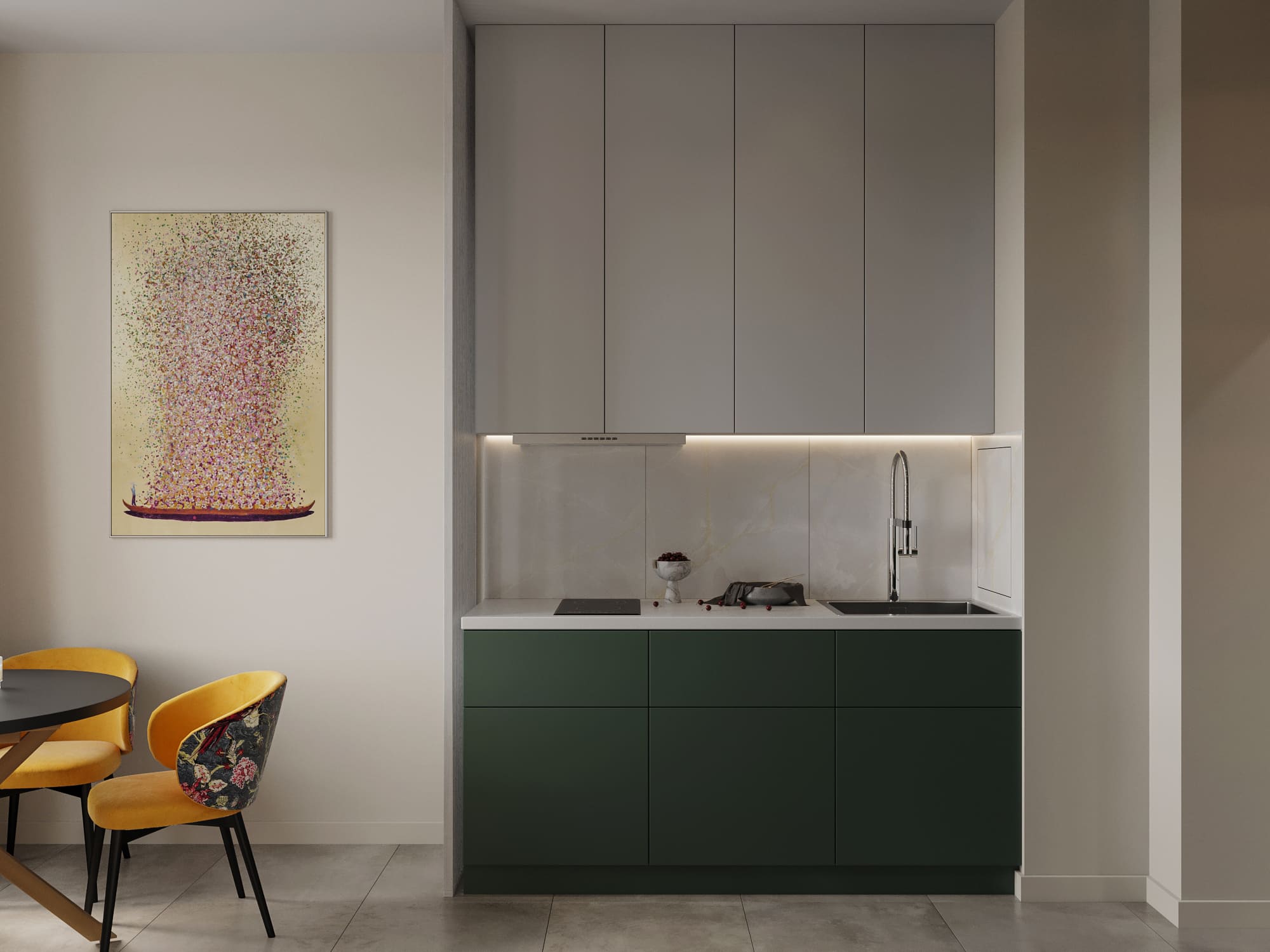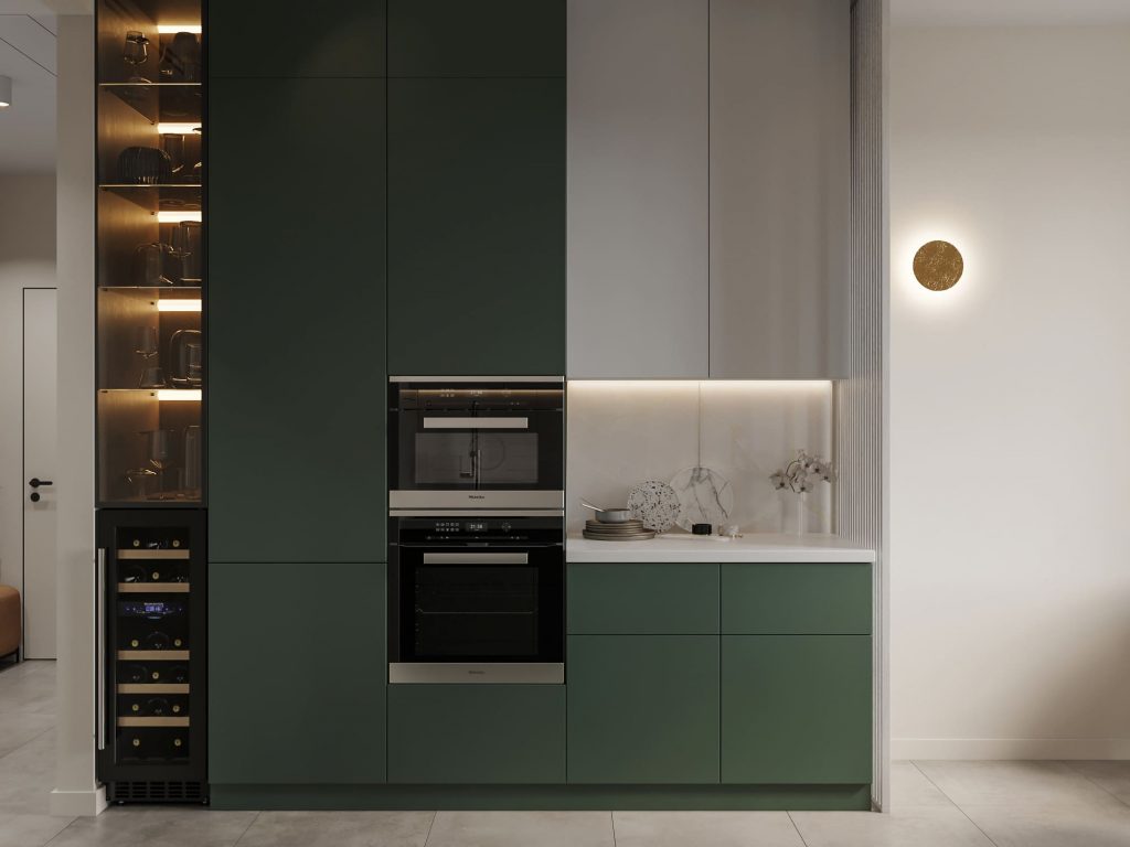 Кухня выполнена в стиле современного минимализма. Цветовое решение основано на контрасте: глубокий тёмно-зелёный низ и светло-серые верхние шкафы создают глубину и лёгкость. Белая столешница и фартук подчёркивают чистоту линий.