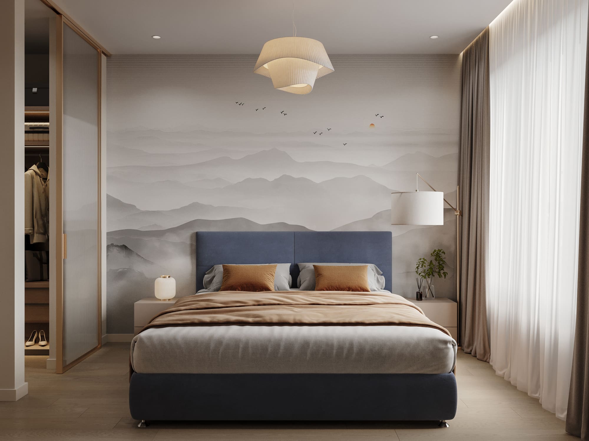 Центром стала кровать с мягким синим изголовьем, добавляющим элегантность. Уют формирует текстиль в нейтральных тонах: покрывало и декоративные подушки.