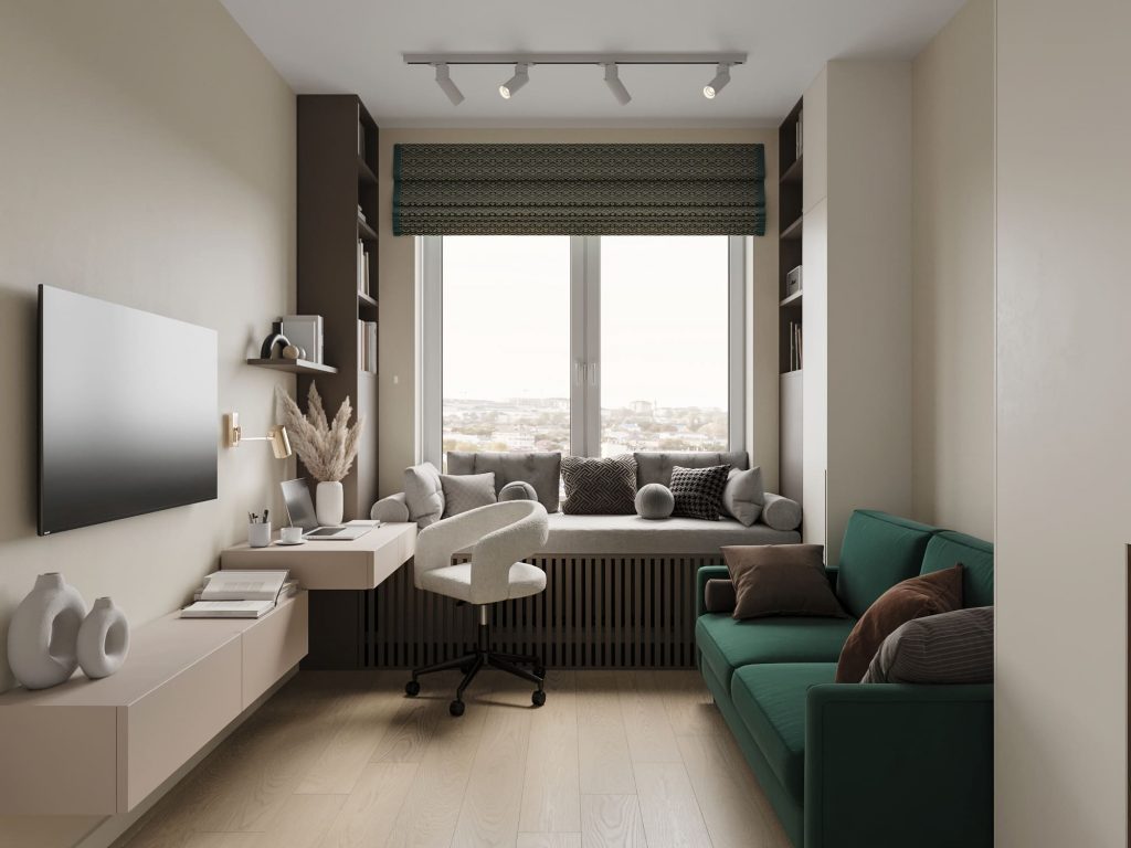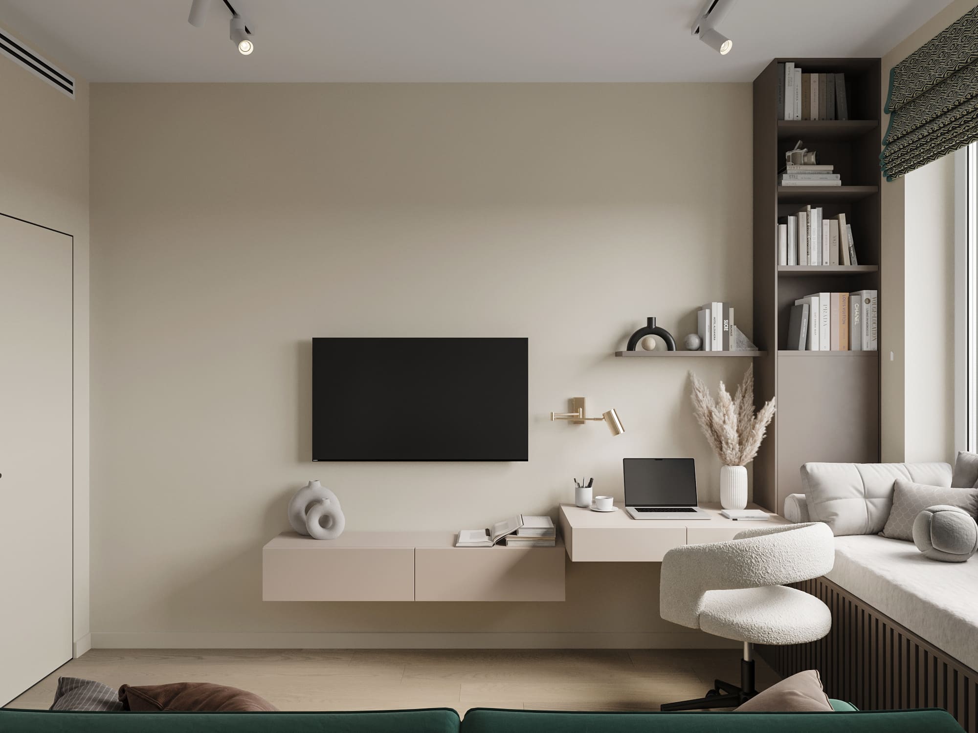 Слева от окна организована рабочая зона с лёгким белым столом и мобильным стулом, рядом на стене закреплён телевизор.