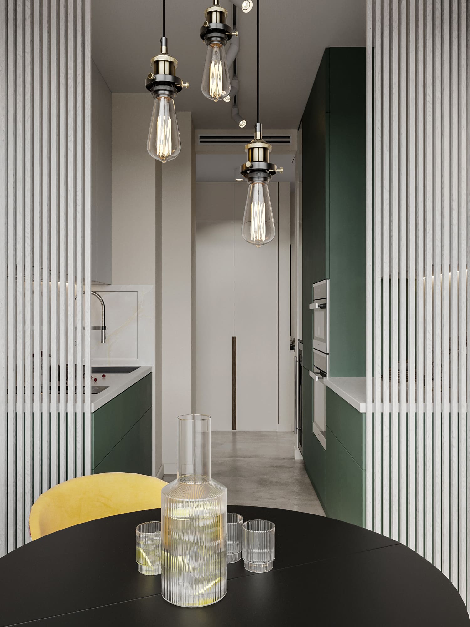 Вертикальные панели на стенах добавляют пространству объёма и помогают в зонировании. Подвесные светильники в индустриальном стиле с открытыми лампами служат одновременно функциональным и акцентным элементом, создавая тёплое освещение.