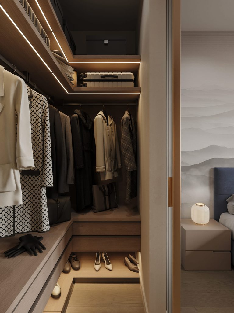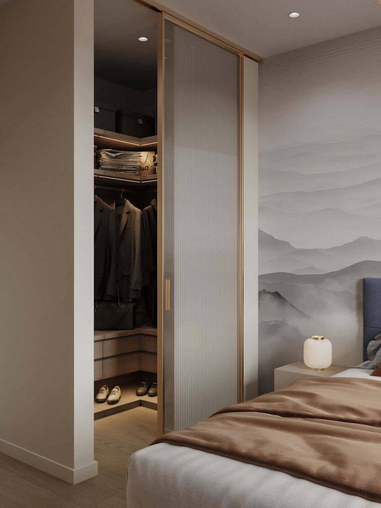 Гардеробная, интегрированная в спальню — образец функционального минимализма. Пространство организовано с помощью встроенной системы хранения с чётким зонированием: верхние полки для аксессуаров, центральная часть для одежды и нижние модули для обуви.
