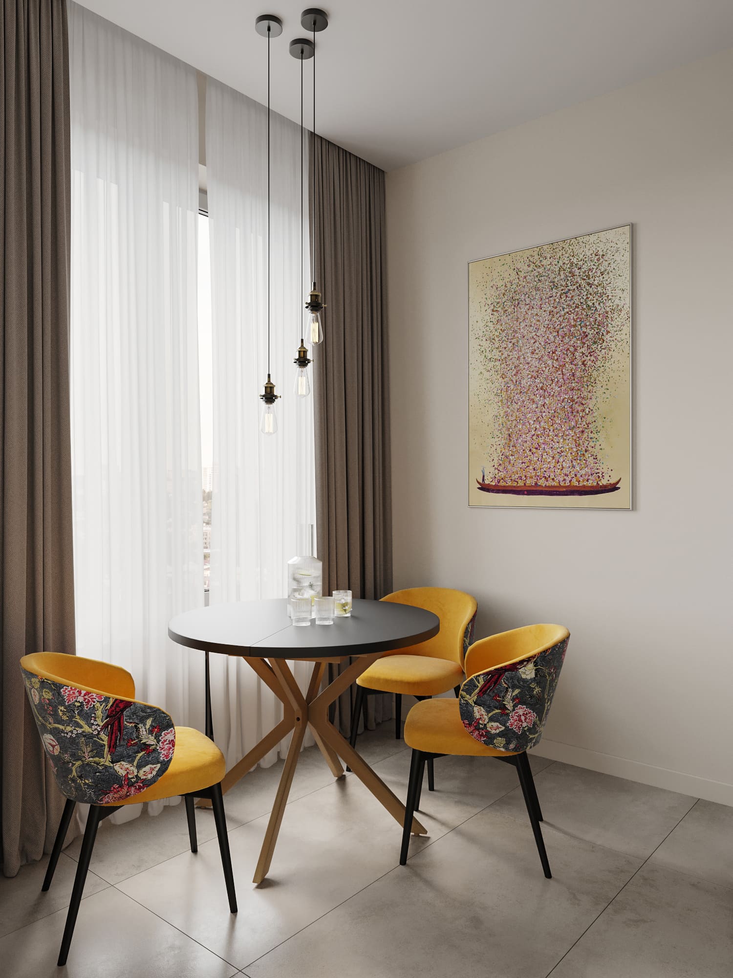 Акценты расставили дозированно: жёлтые стулья в обеденной зоне и абстрактная картина добавляют индивидуальности, а гладкие фасады и практичные материалы завершают образ.