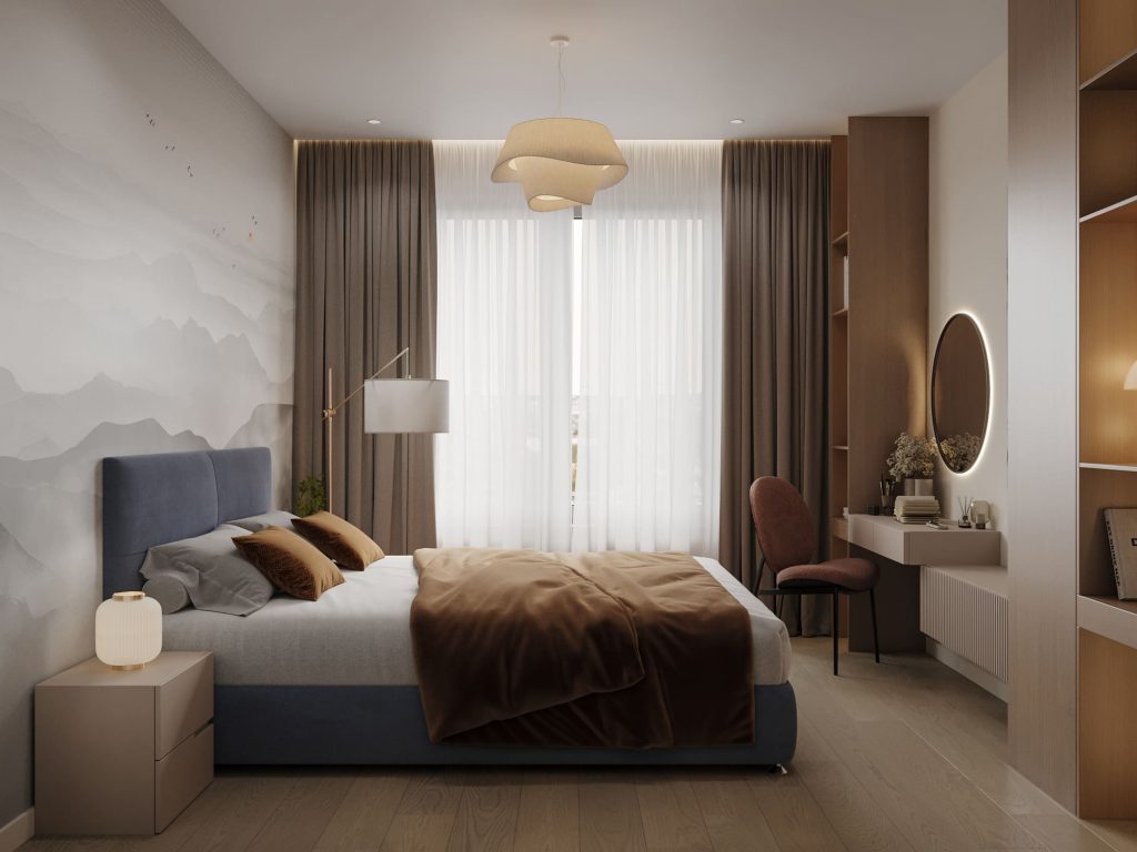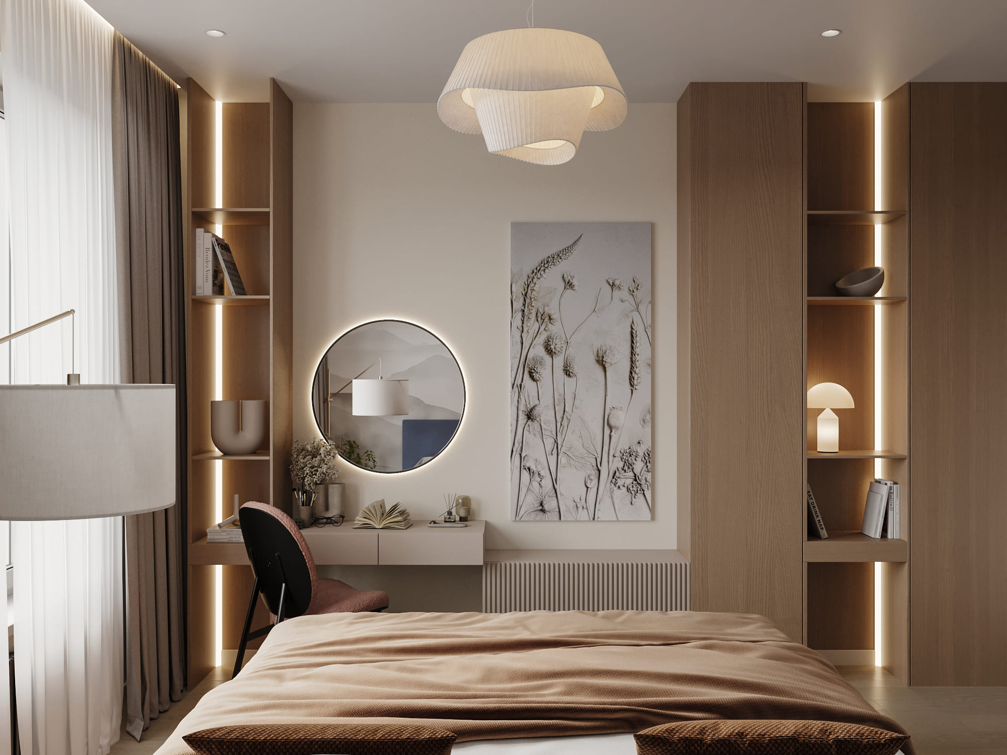 Особое внимание уделили свету: окно с двойными шторами и подвесная лампа над кроватью создают комфортную атмосферу. Для функциональности предусмотрели рабочий уголок с креслом. Зеркало в круглой раме визуально расширяет пространство, а встроенные системы хранения сохраняют минималистичный стиль.