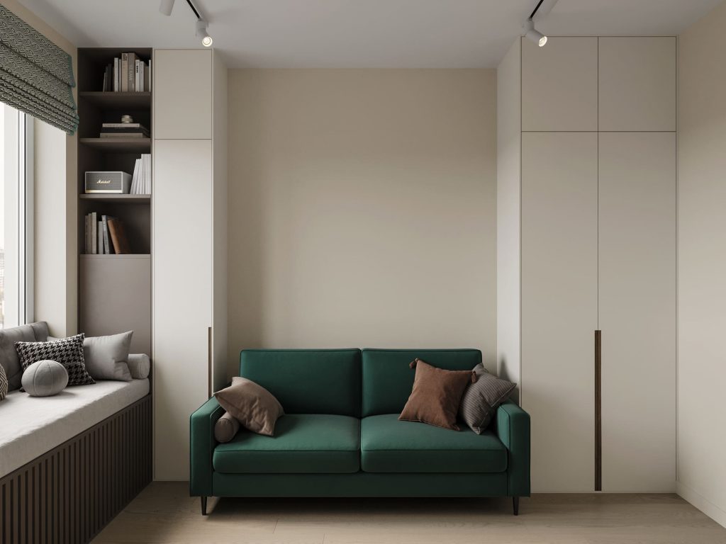 Мы сделали ставку на естественный свет от большого окна, оформленного лаконичными шторами. Под ним разместили диван насыщенного зелёного цвета — яркий акцент, который задаёт настроение. Нейтральные подушки добавляют уюта.