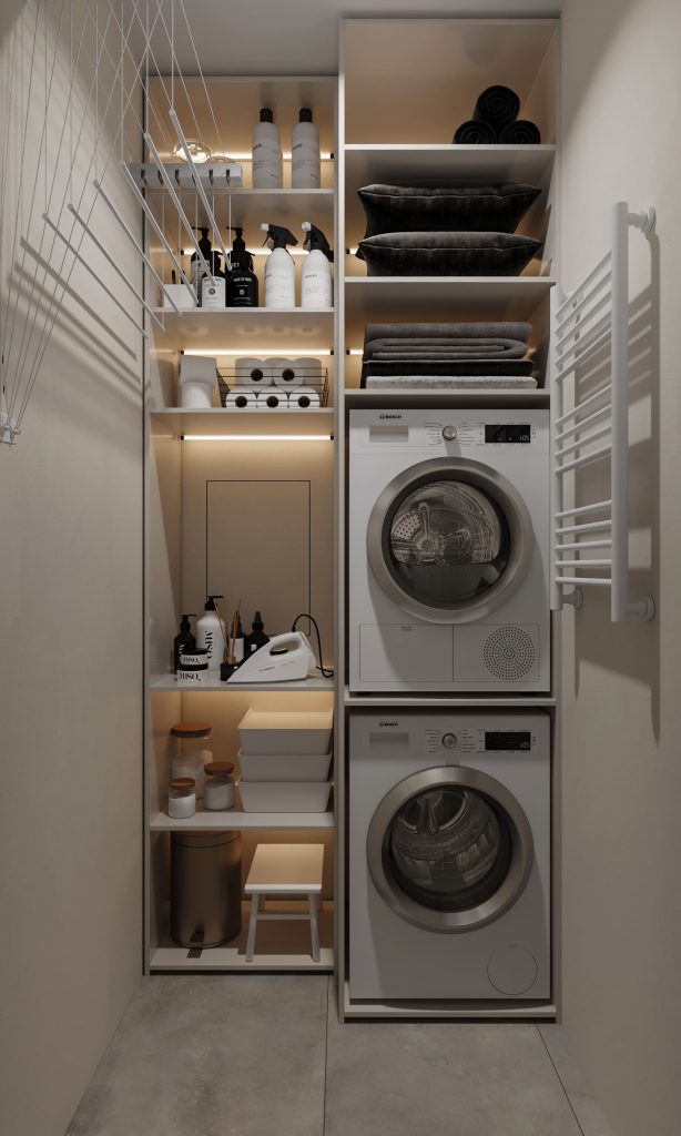 В помещение интегрированы компактные сушилки для белья, а стиральная и сушильная машины расположены на удобной высоте. Спокойная нейтральная цветовая гамма усиливает ощущение чистоты.