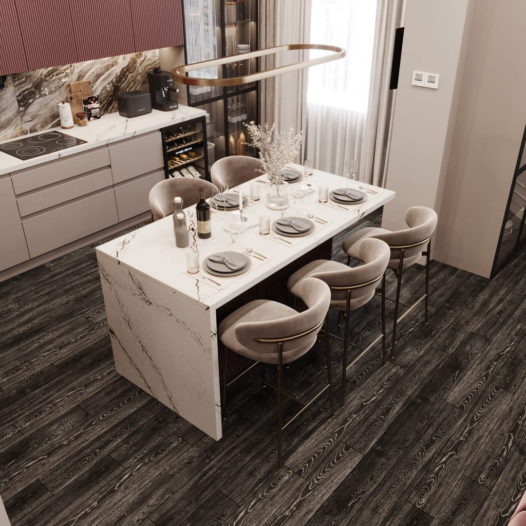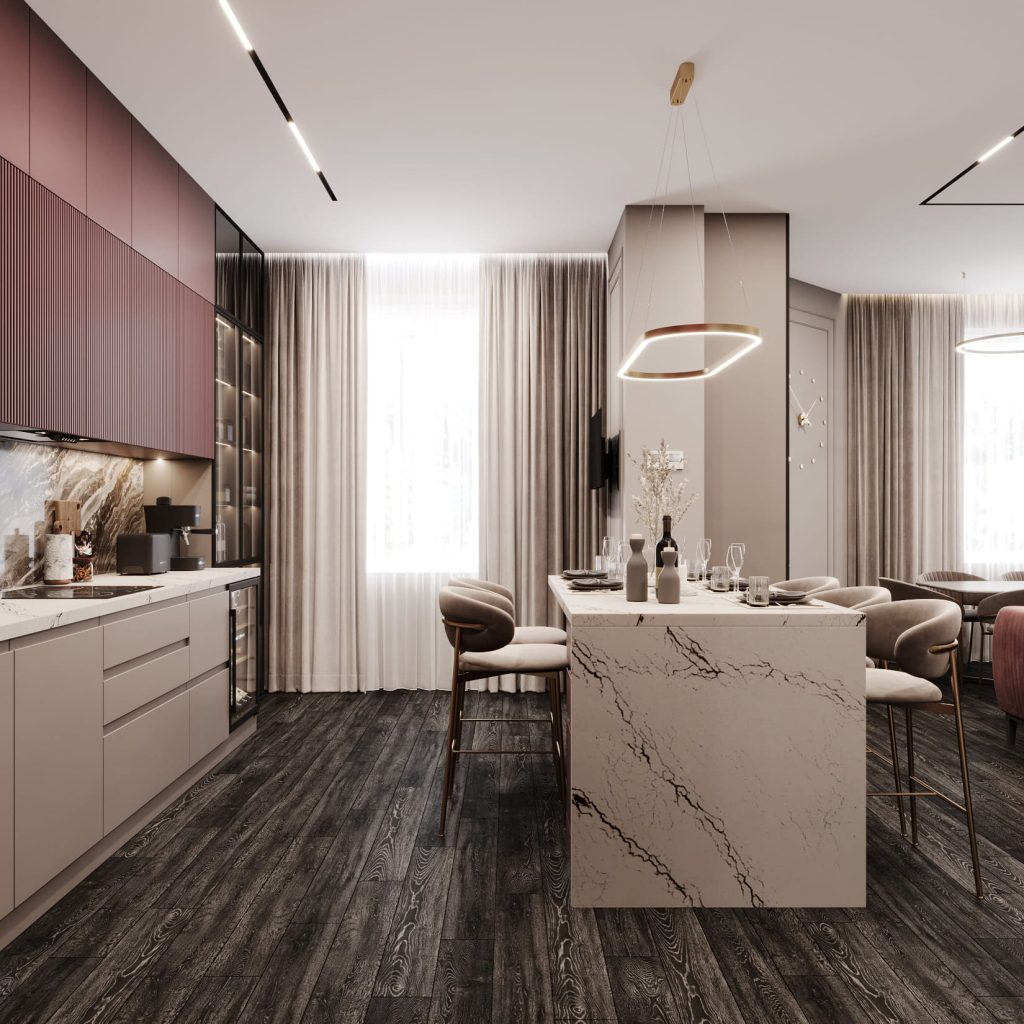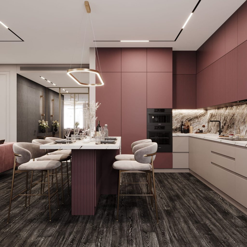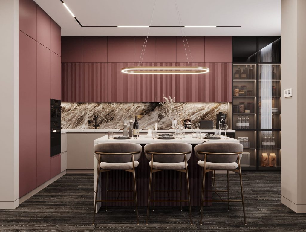 Кухонная зона — яркий акцент квартиры. Фасады в ягодно-пыльном оттенке и вертикальные рейки на верхних модулях добавляют ритма и глубины. Для нижнего яруса выбраны спокойные нейтральные тона, чтобы уравновесить композицию.