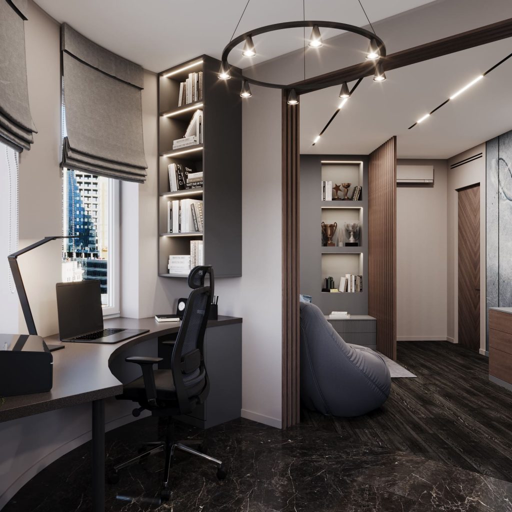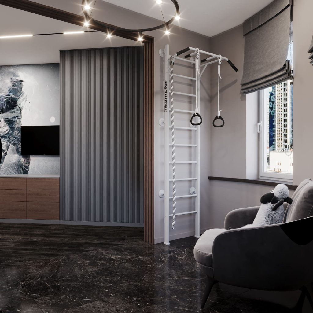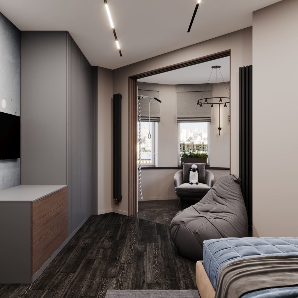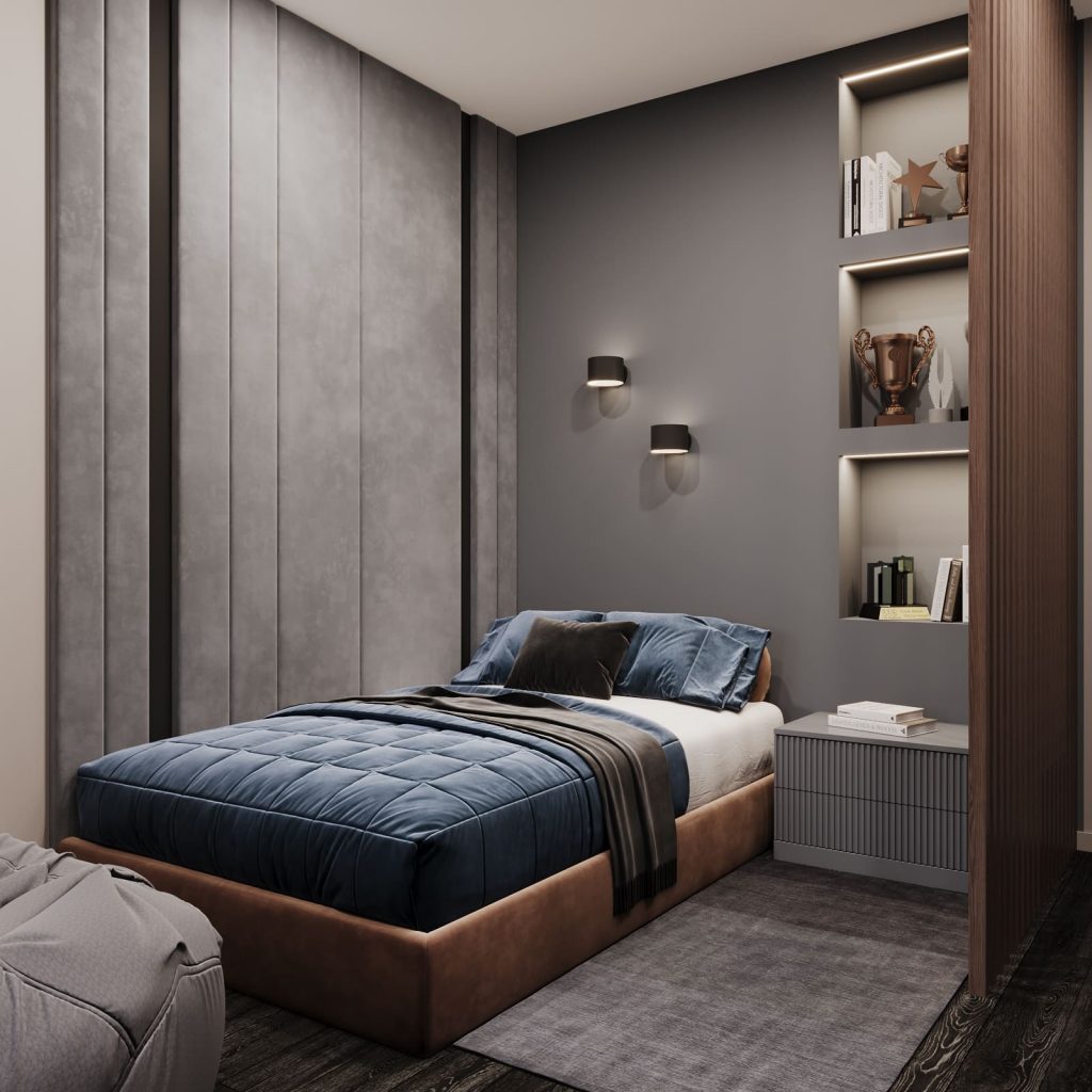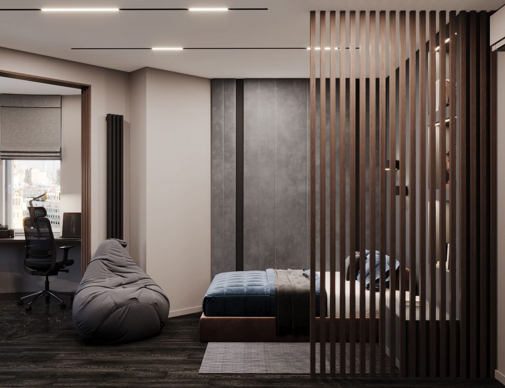 Спальное место отделено деревянной перегородкой из вертикальных ламелей — визуально лёгкой, но создающей уединение. Над кроватью — встроенные ниши с подсветкой для книг и наград, а рядом — мягкое кресло-мешок для отдыха.