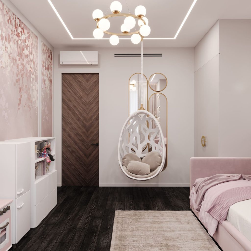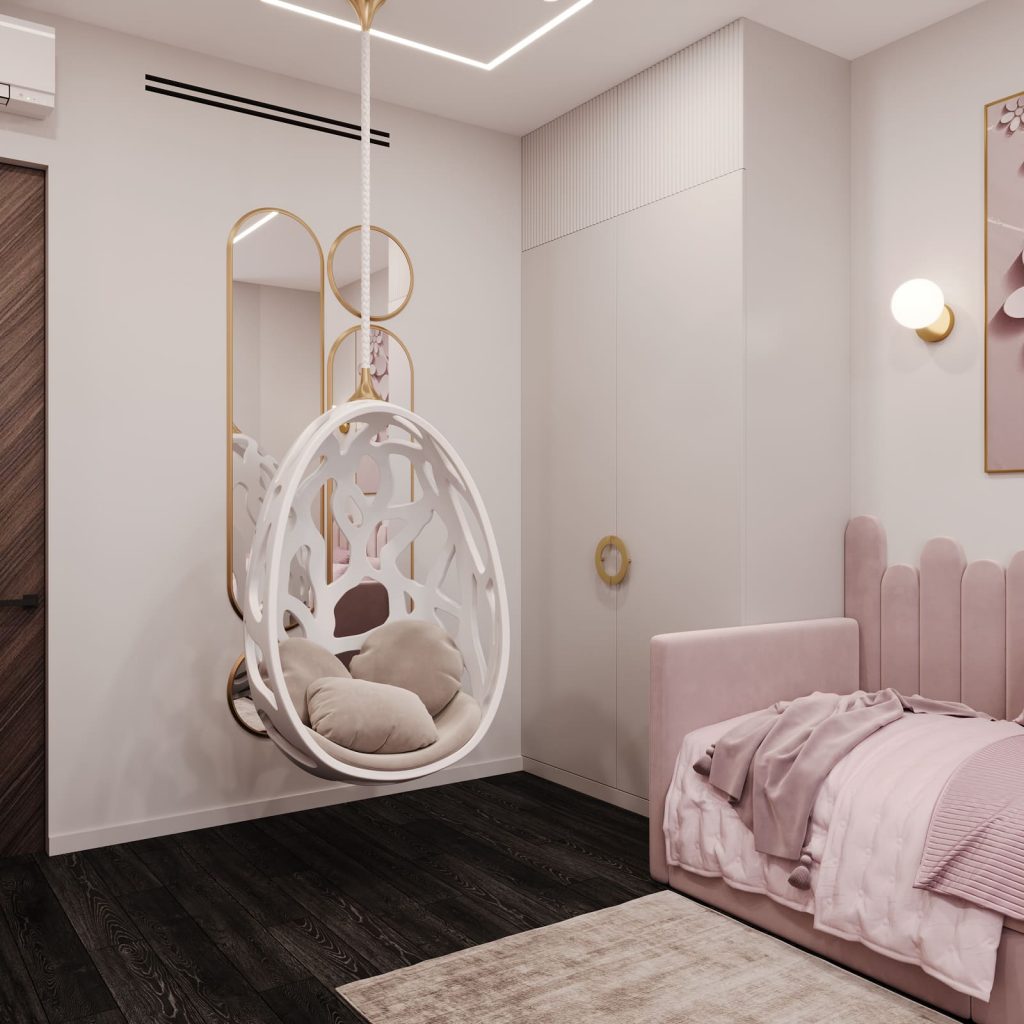 Одно из самых любимых решений — подвесное кресло-яйцо. Это не только эффектный элемент декора, но и уголок для отдыха и уединения. Стена с обоями, имитирующими цветущий сад, делает пространство лёгким и живым.