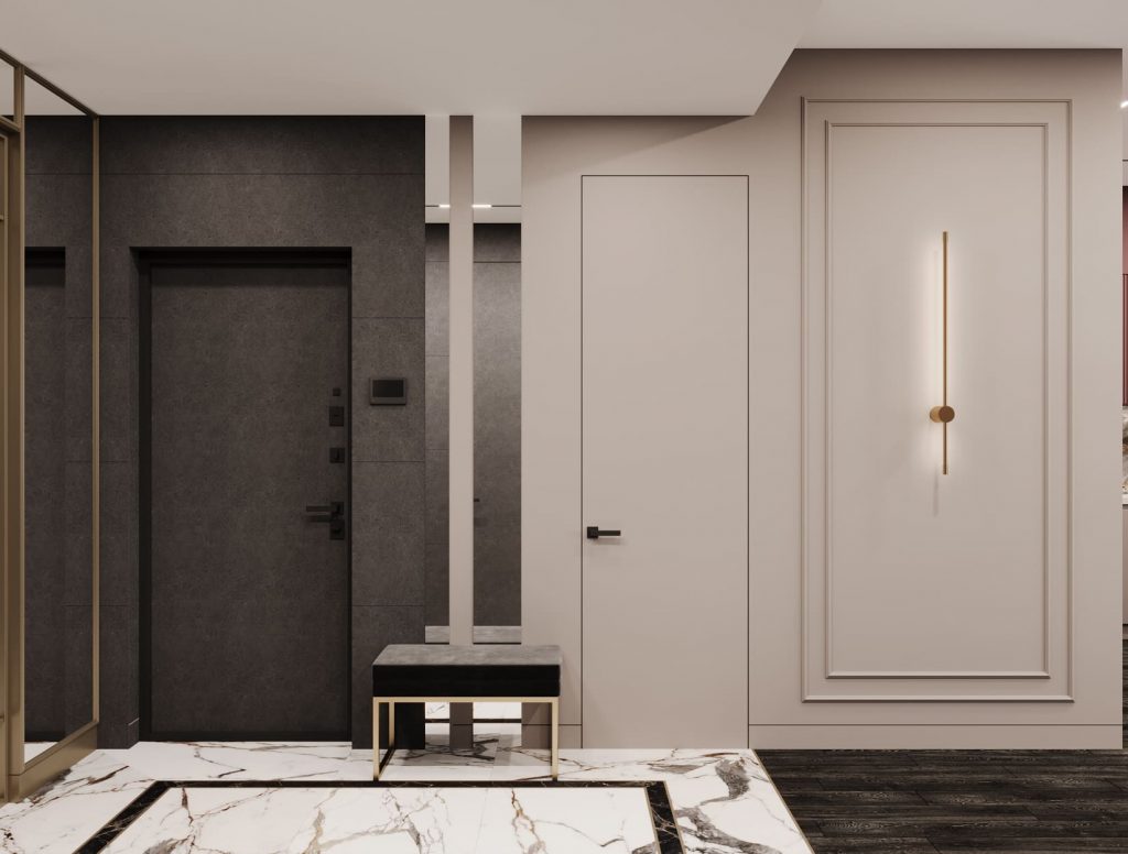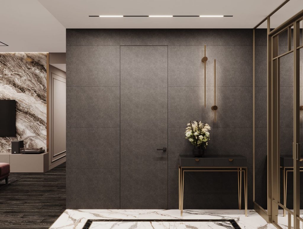 Сдержанная гамма, чёткая геометрия и акцент на фактуру — прихожая сразу задаёт тон всему интерьеру. На полу — керамогранит под мрамор с чёрной рамкой, зонирующей вход. Стены отделаны тёмными панелями под камень.