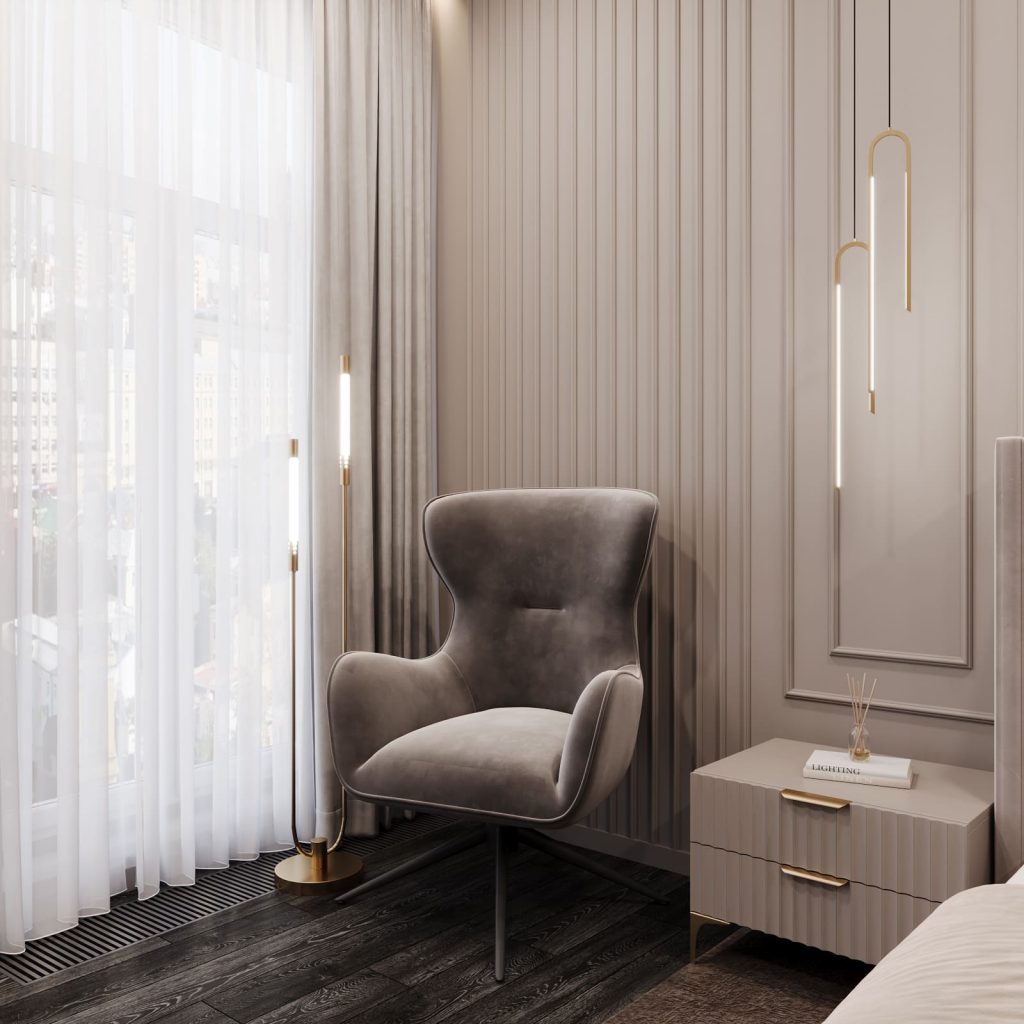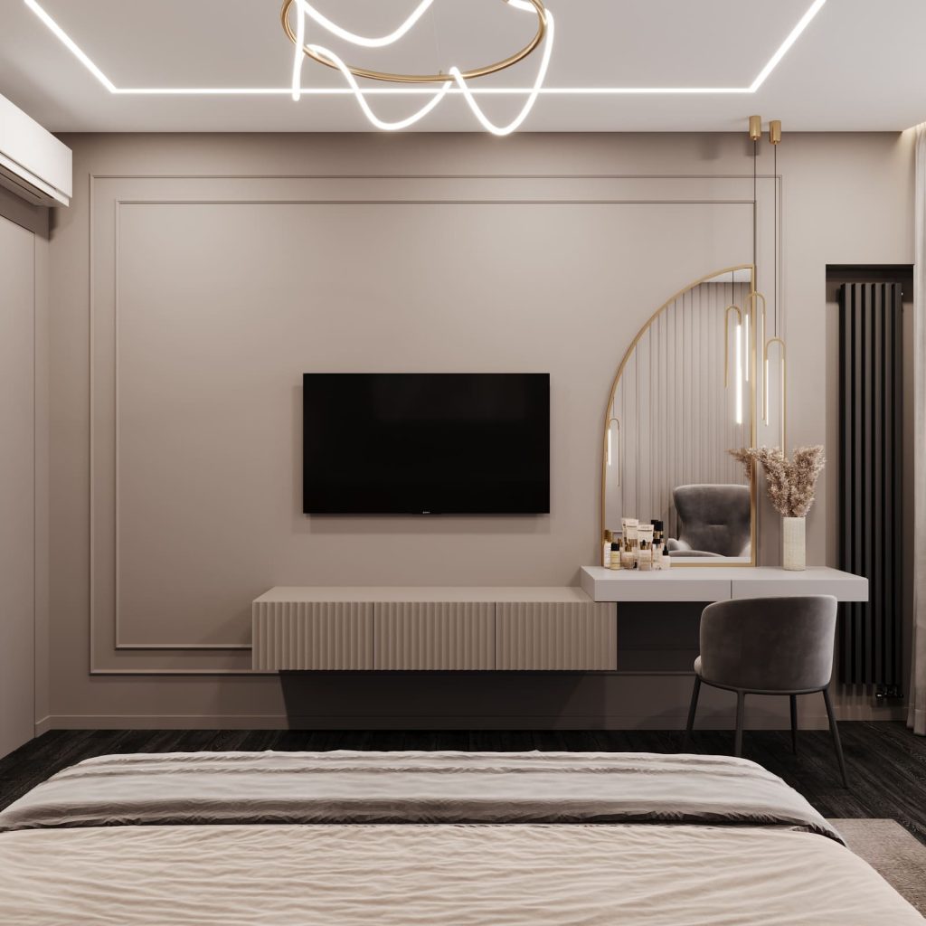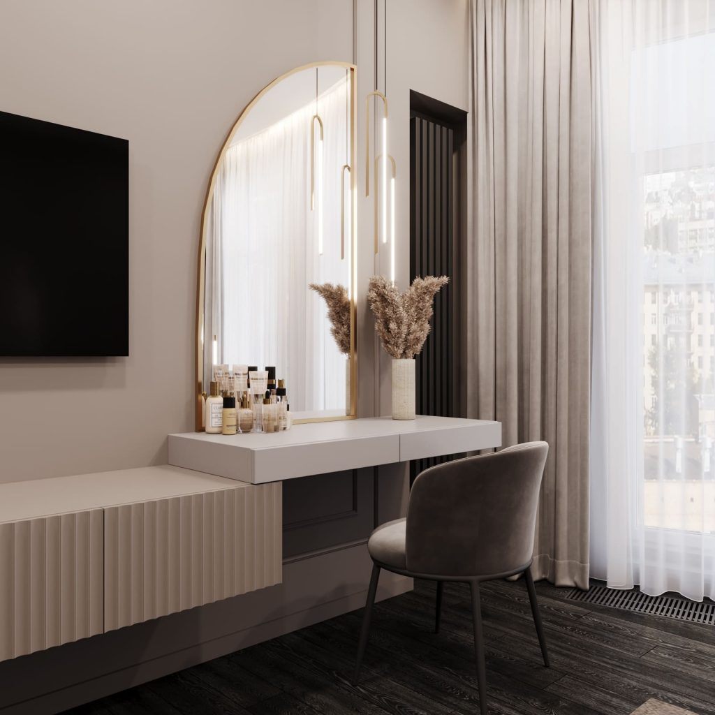 У окна — кресло для чтения и напольный светильник, а напротив кровати — ТВ-зона с подвесной тумбой и туалетным столиком. Зеркало в золотой раме и легкий пуф завершают образ, не перегружая пространство.