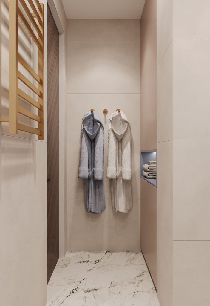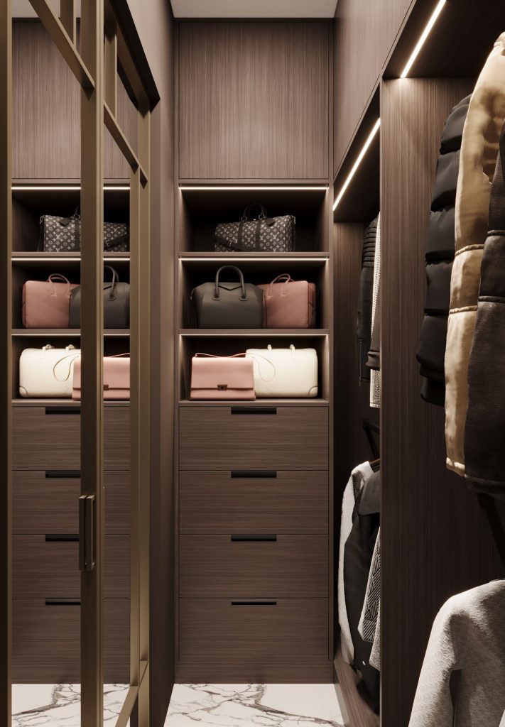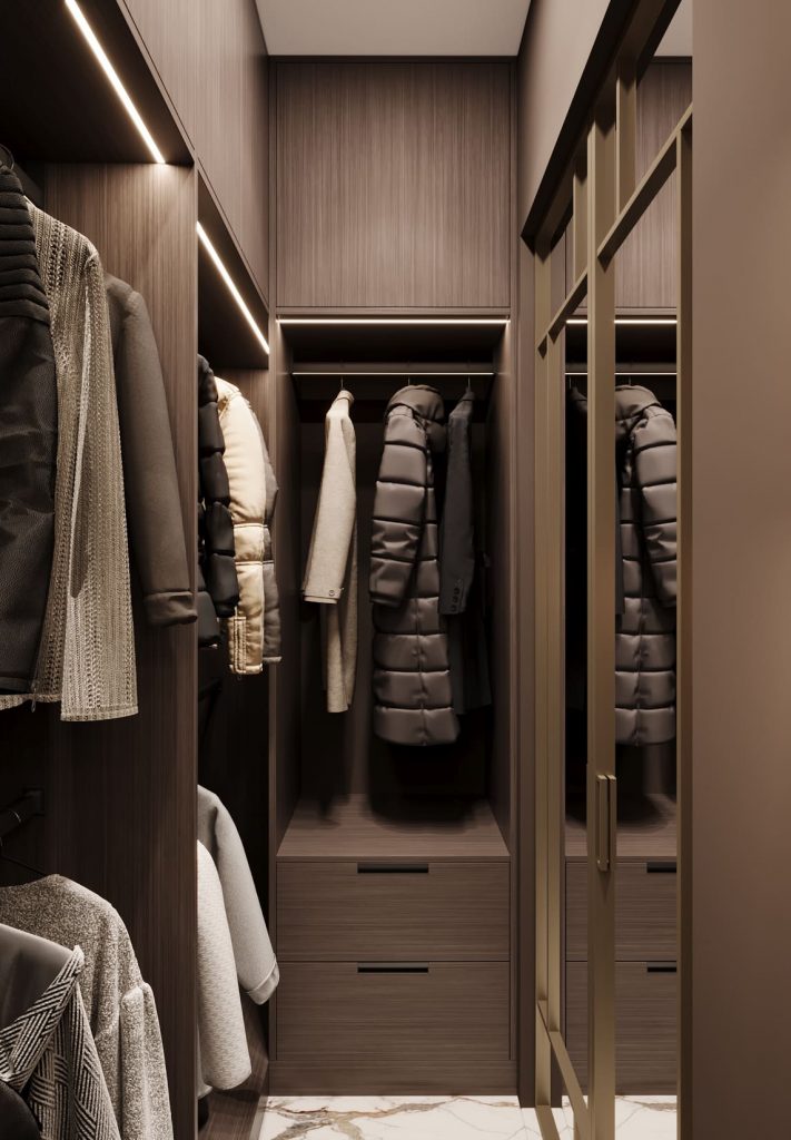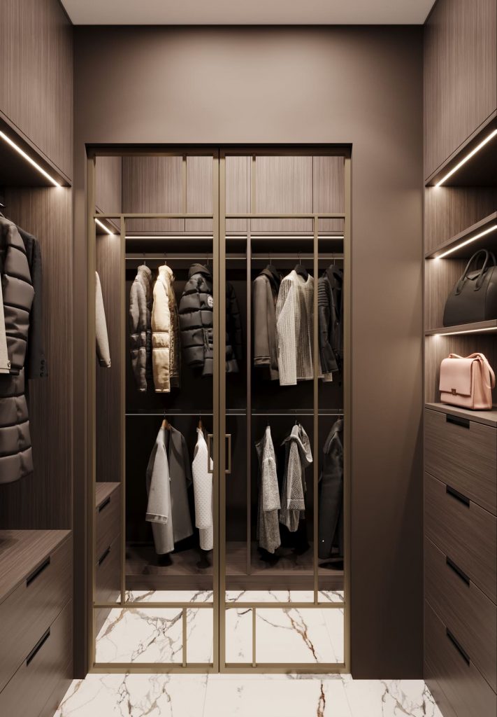 Пространство организовано рационально и удобно: штанги для короткой и длинной одежды, глубокие ящики и открытые полки для сумок. Потолочная подсветка подчёркивает аккуратную структуру хранения. Фасады с текстурой дерева и бронзовые рамки стеклянных дверей создают ощущение уюта и премиальности. Пол выложен тем же керамогранитом, что и в санузле, — для визуальной связи с остальным интерьером.