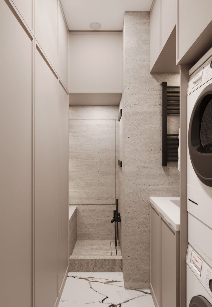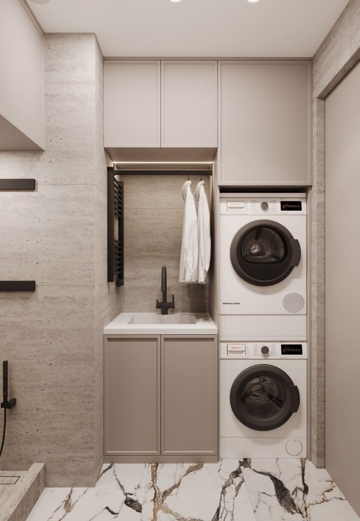 Стиральная и сушильная машины расположены вертикально — это позволило оставить место для полноценной раковины с зоной сушки одежды и удобной системой хранения. Над раковиной предусмотрен рейлинг и точечная подсветка.