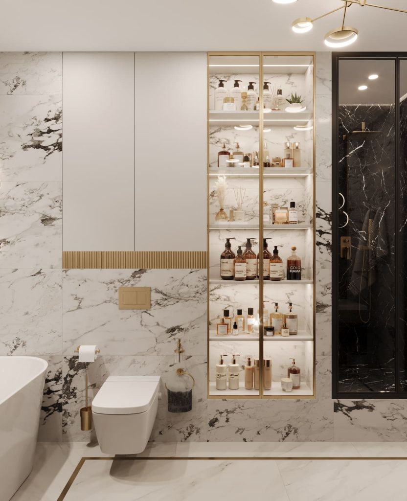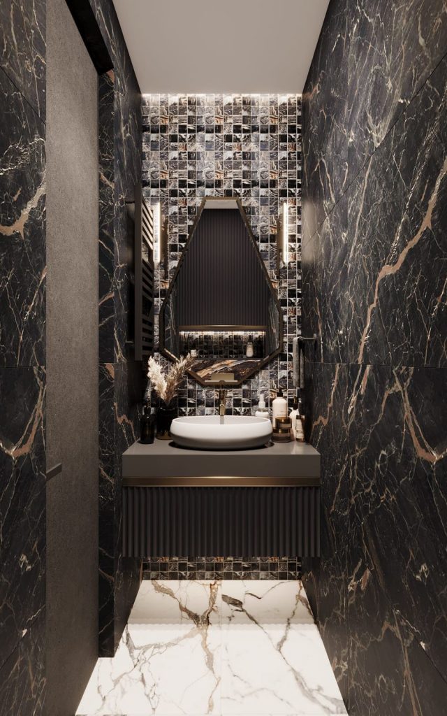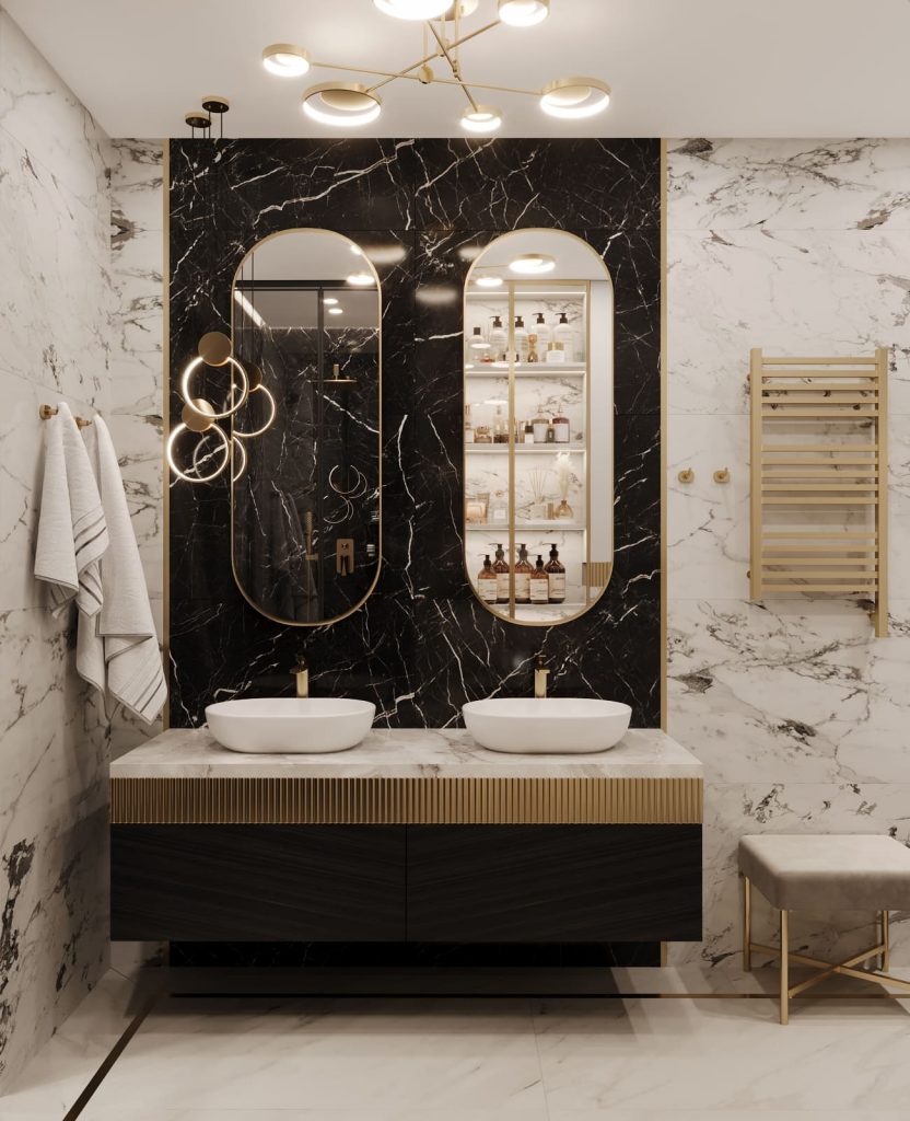 В отделке использован керамогранит под мрамор двух оттенков: светлый с серо-чёрными прожилками и глубокий чёрный с контрастными белыми вкраплениями. В сочетании с латунными деталями это создаёт ощущение дорогого, цельного пространства.