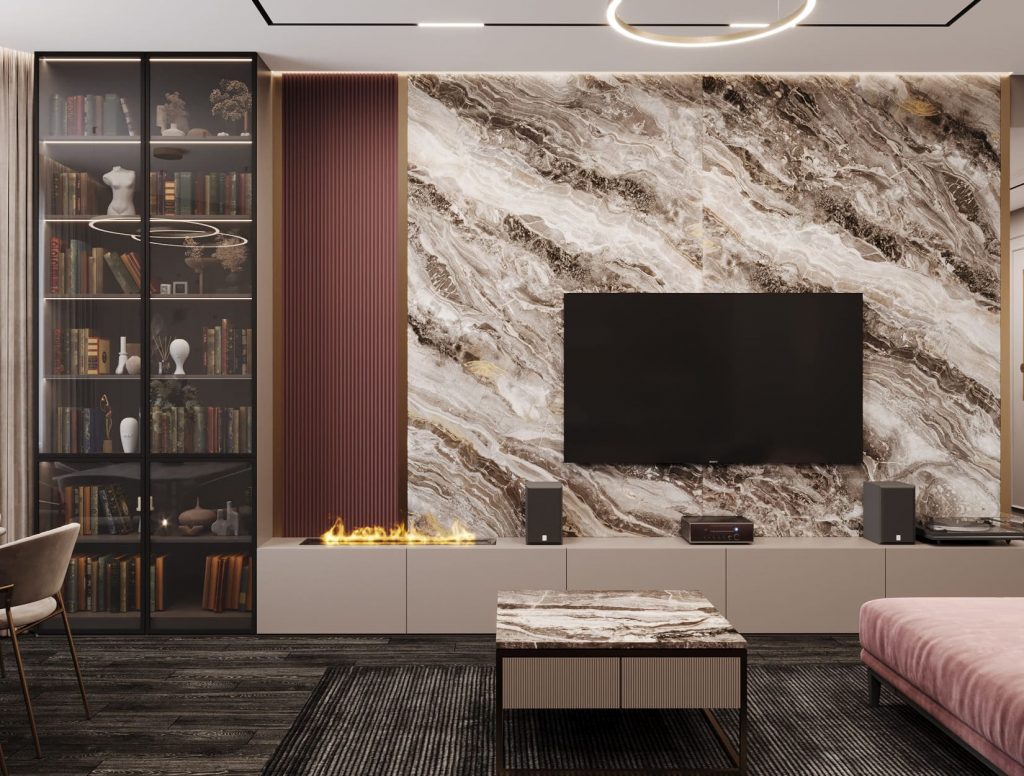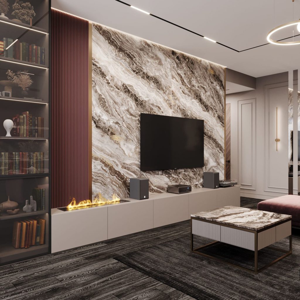 Акцентная стена за телевизором оформлена крупноформатным мраморным полотном с выразительным природным рисунком и подсветкой по периметру.