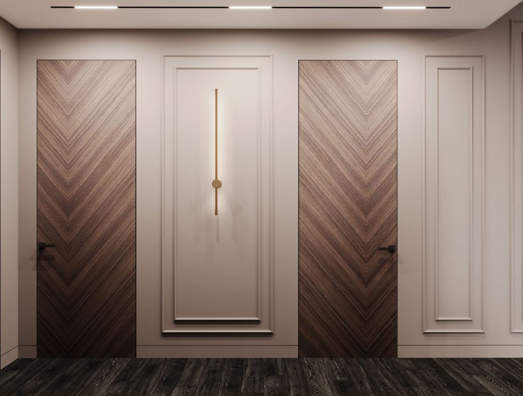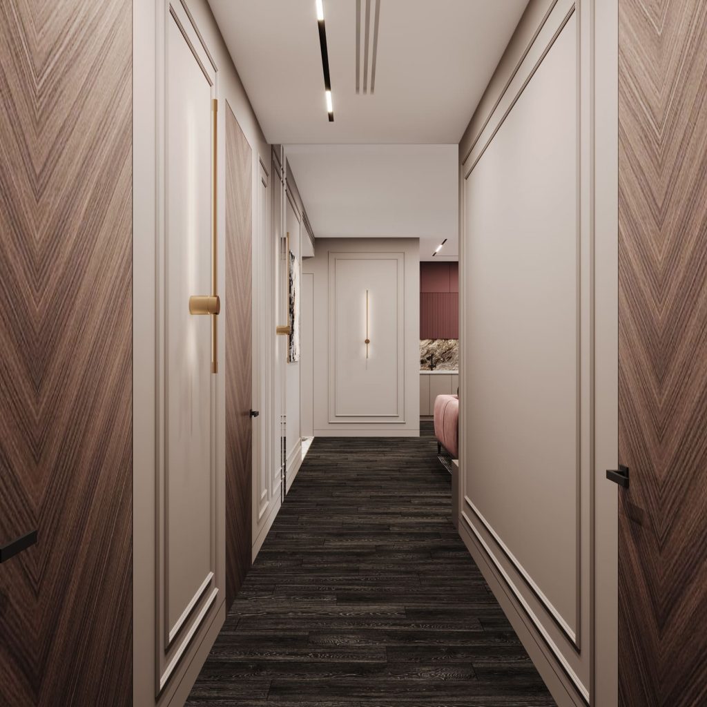 Коридор стал не просто переходной зоной, а полноценной частью интерьера. Стены оформлены в светлом тоне с молдингами, подчёркивающими классику в современном прочтении. Акцент — двери с диагональным шпоном «ёлочкой» в тёплом древесном оттенке, которые создают ритм и визуально расширяют пространство.