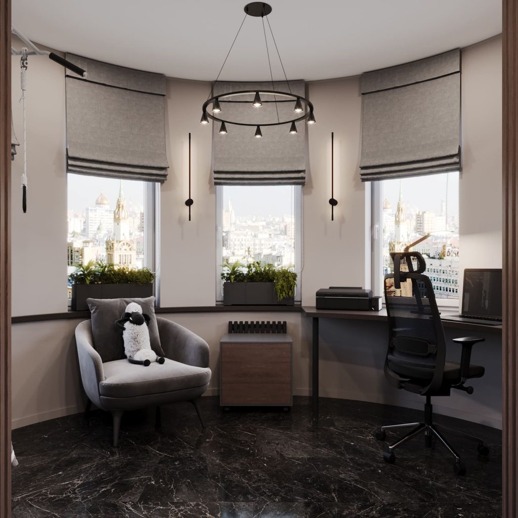 Учебное место у окна — с лаконичным белым столом и комфортным креслом на ножках с латунными деталями.