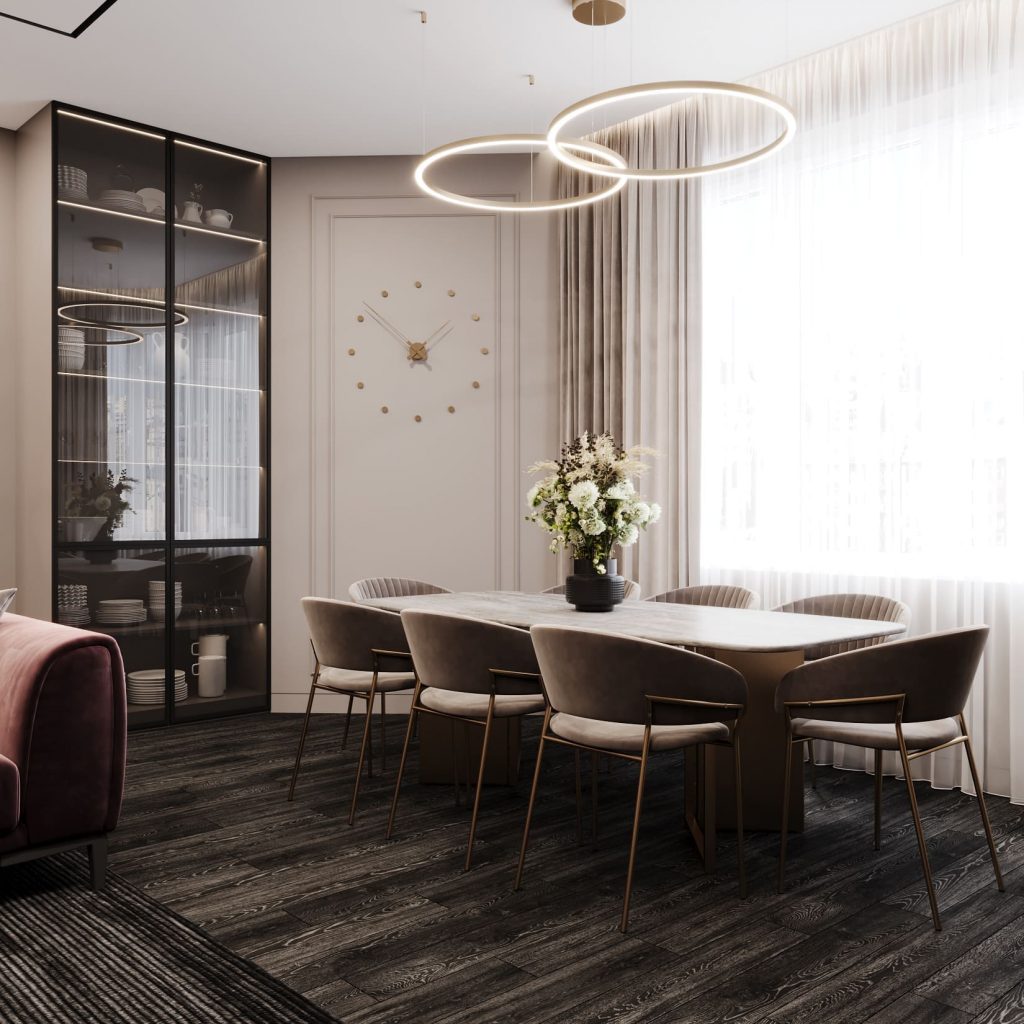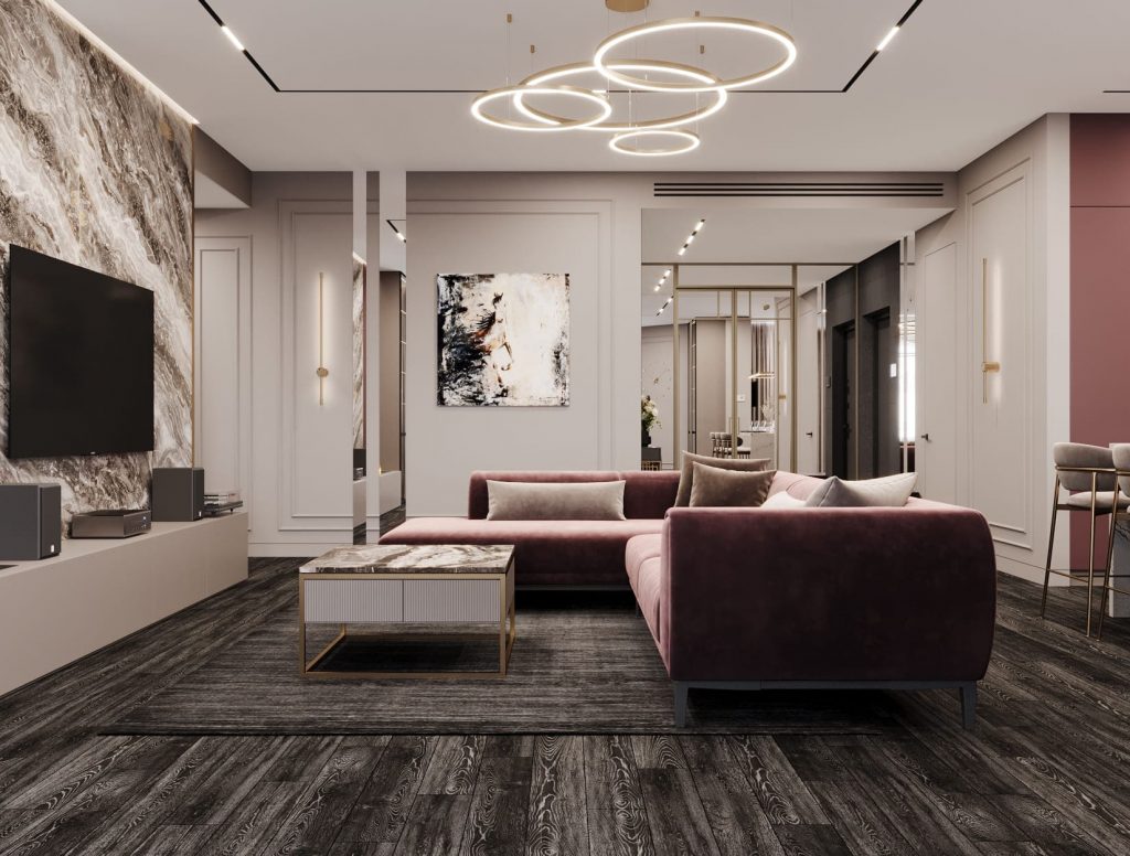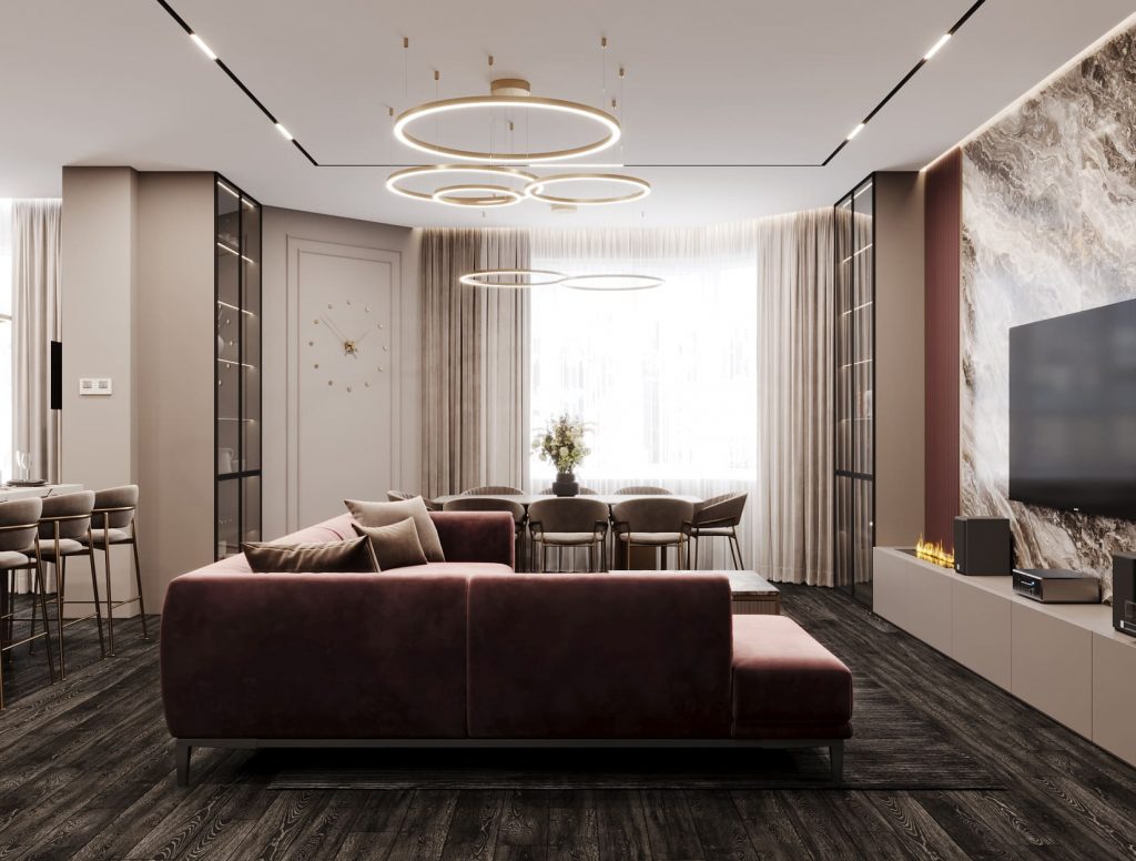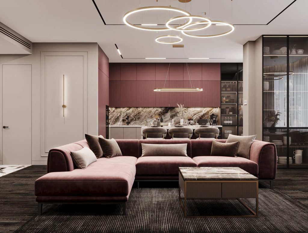 В центре — глубокий угловой диван в пудрово-сливовом оттенке. Его форма зонирует помещение, отделяя его от кухни и обеденной группы.