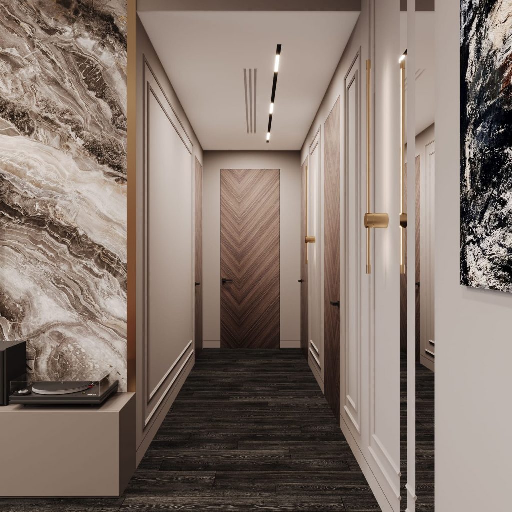 Тёмный деревянный пол добавляет глубины и контраста, а встроенное потолочное освещение мягко ведёт по маршруту. Светильники на стенах — лаконичные, с латунными элементами, перекликаются с деталями в прихожей.