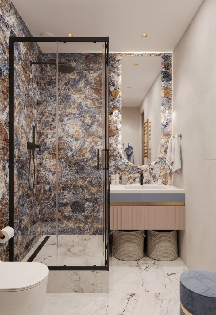 Санузел выполнен в светлой гамме с акцентной мраморной плиткой с ярким узором в душевой зоне и за унитазом. Стены облицованы крупноформатным керамогранитом под светлый камень, пол — в той же текстуре. Душевая — с черным профилем, встроенным тропическим душем и ручной лейкой.