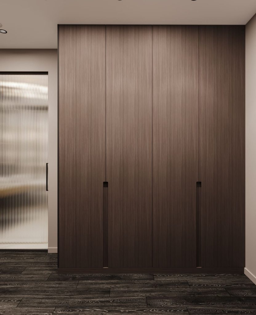 Система хранения встроена: ровные фасады шкафа не привлекают лишнего внимания, но решают задачу размещения вещей — особенно важную для семьи с детьми.