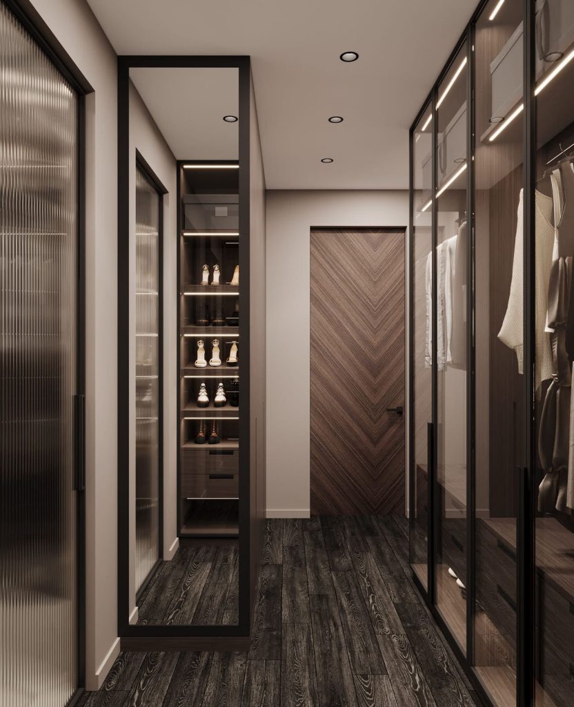 Гардеробная при мастер-спальне оформлена в современном стиле с тёплой деревянной отделкой, стеклянными фасадами и встроенной подсветкой. Пространство зонировано: предусмотрены секции для верхней и повседневной одежды, полки для обуви и аксессуаров, выдвижные ящики и вместительные антресоли. На полу — тёмное дерево с выразительной текстурой. Зеркало в чёрной раме визуально расширяет пространство и завершает образ функционального и стильного интерьера.