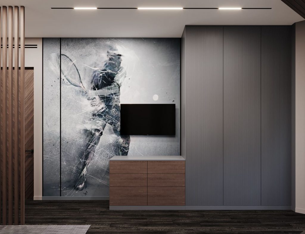 Цветовая палитра сдержанная: графит, бетон, дерево, глубокий синий. На стене у ТВ — эффектный арт с теннисистом, отражающий увлечения подростка. Рабочая зона расположена у окон: стол на всю длину стены, с местом под технику, учебники и вид на город.