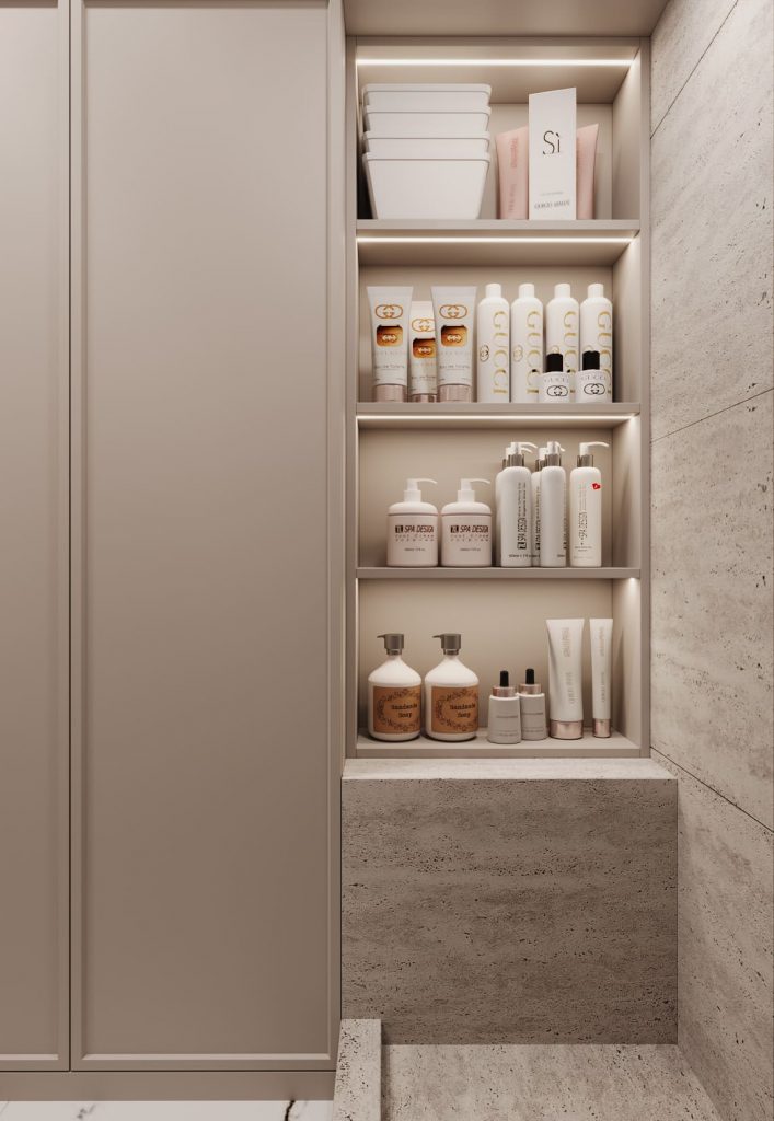 Ванна — отдельно стоящая, с нишей под аксессуары. Эта зона оформлена как композиционный центр: рамка из тёмного камня обрамляет белые стены, а встроенные светильники подчёркивают рельеф и объёмы. Ниша в мозаике с подсветкой — не только функциональна, но и декоративна.