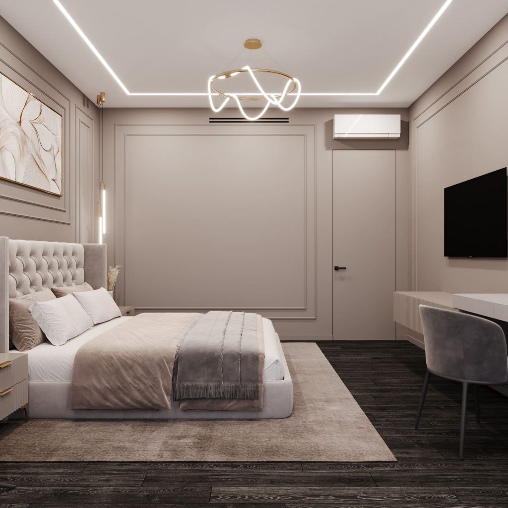 Главная спальня выполнена в мягкой, спокойной палитре, где доминируют тёплые серо-бежевые тона. Центром композиции стало изголовье кровати — высокое, мягкое, с классической стёжкой. Оно задаёт ритм всей стене, оформленной молдингами и дополненной подвесными светильниками с тонкими латунными акцентами.