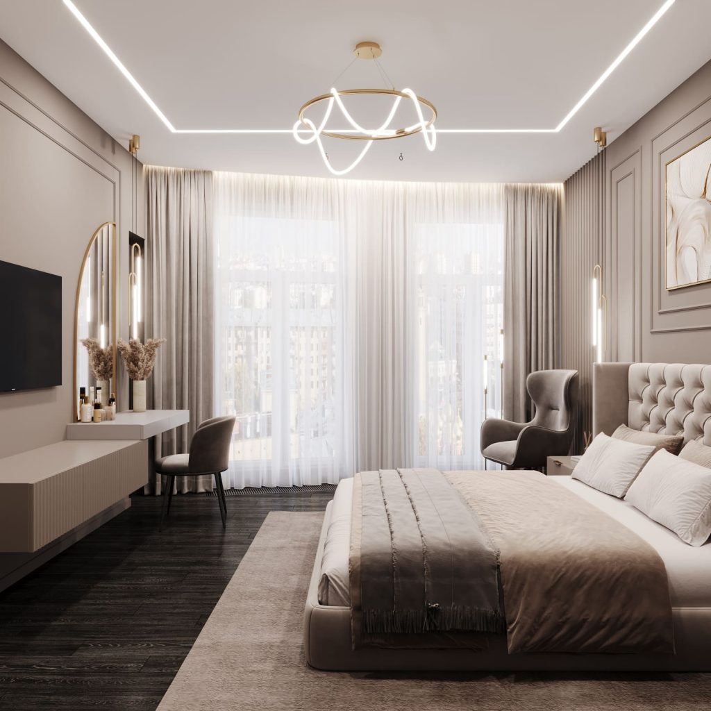 Справа и слева — симметричные прикроватные тумбы с декоративными фасадами. Освещение — продуманное: основная люстра с графичным силуэтом, светящиеся линии по потолку и локальные подвесы создают уют в любое время суток.