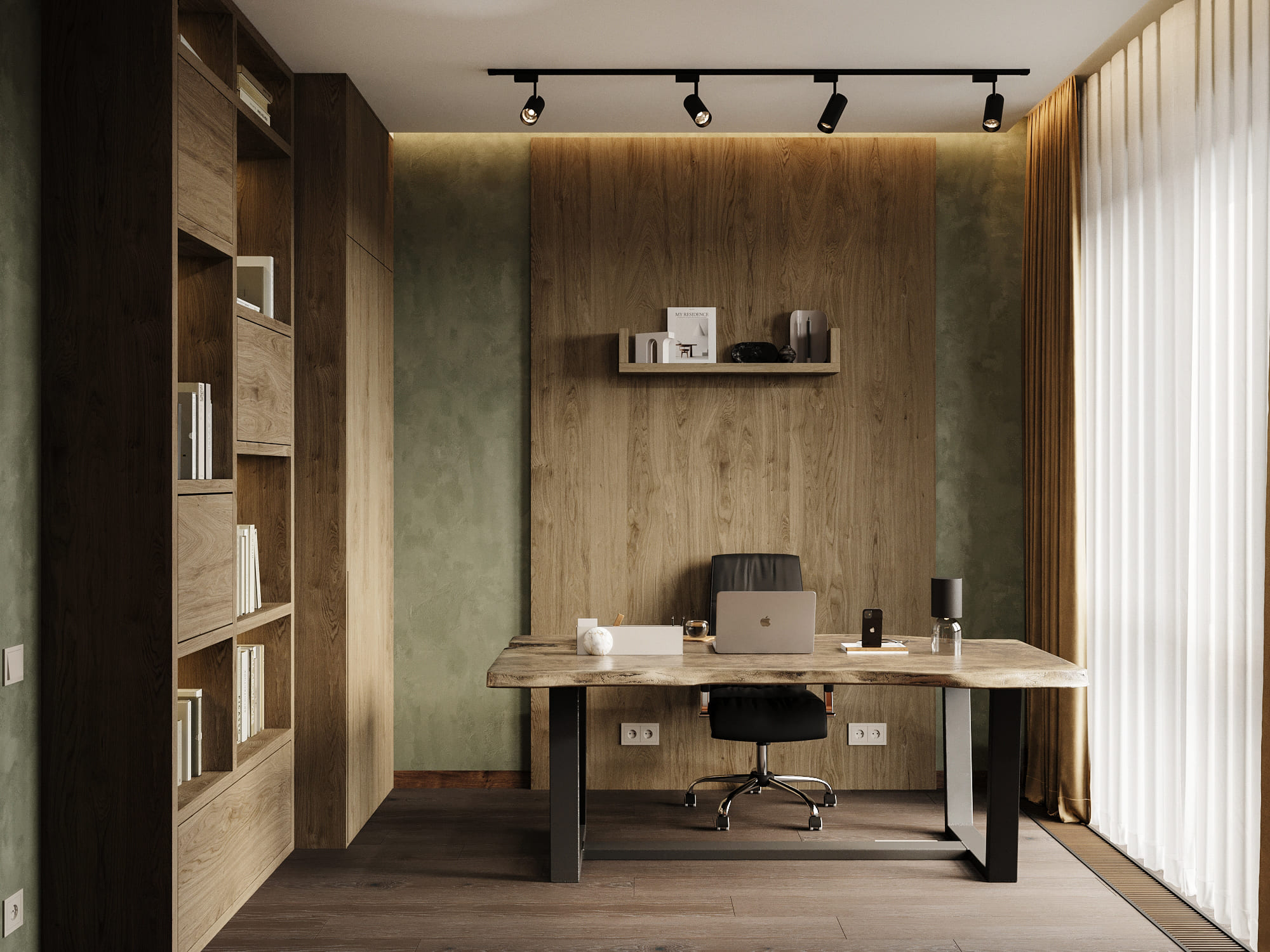 Этот кабинет мы создали как пространство, где вдохновение встречается с концентрацией. За основу была взята спокойная, бледно-зеленая палитра стен, которая настраивает на продуктивную работу; а неяркие желтые шторы добавляют интерьеру ощущение солнечного, живого света. Центром композиции стал монументальный рабочий стол с массивной столешницей из натурального дерева, подчеркивающий статус и любовь хозяина к природным материалам; эту же тему продолжает фактурное деревянное панно за ним, создающее теплый и солидный фон для видеозвонков.