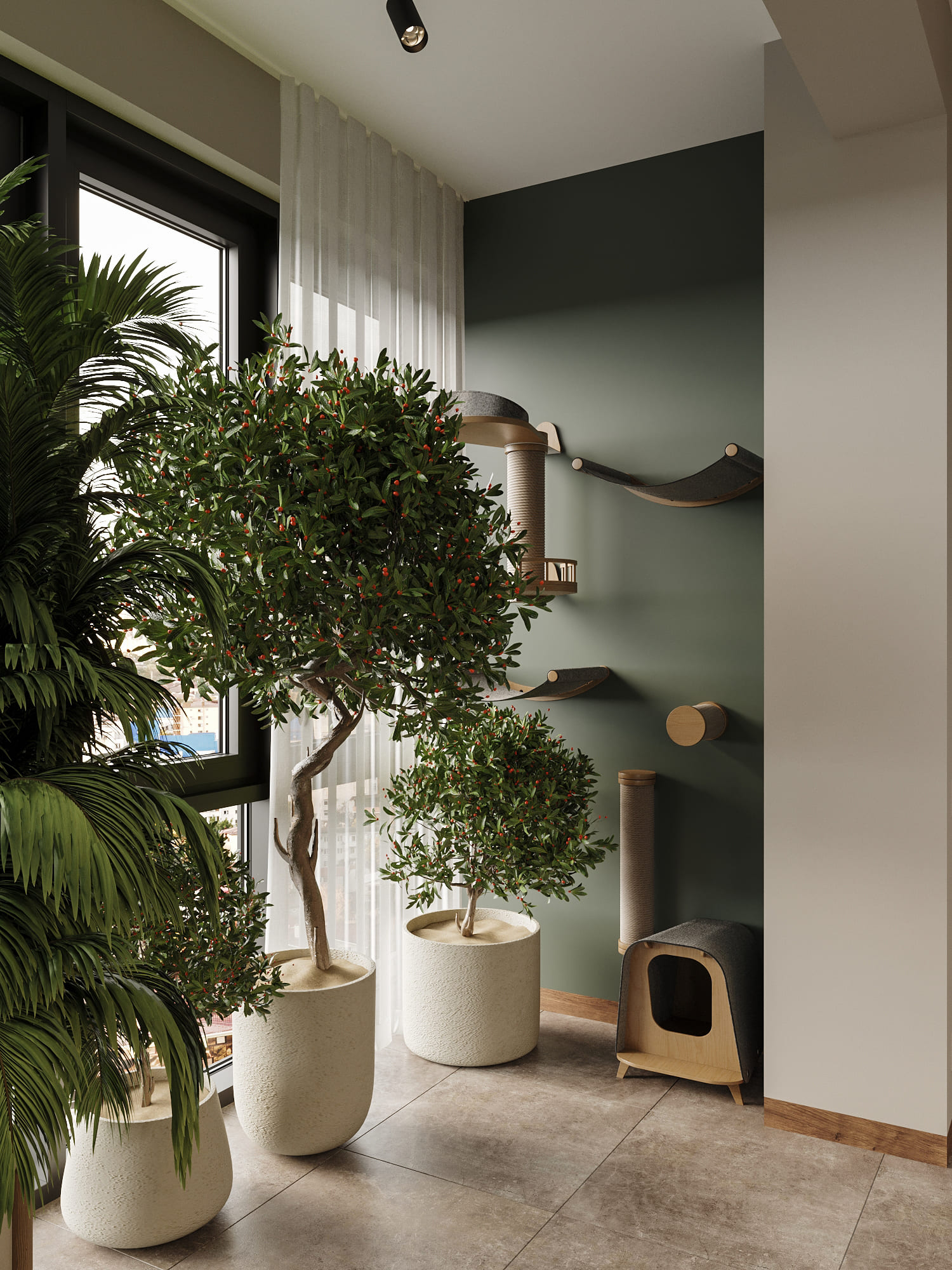 На лоджии предполагается размещение большого количества растений. Также необходимо было по пожеланию заказчиков разместить здесь зону для кошачьего комплекса. Получилось очень уютное пространство с акцентными зелеными стенами.