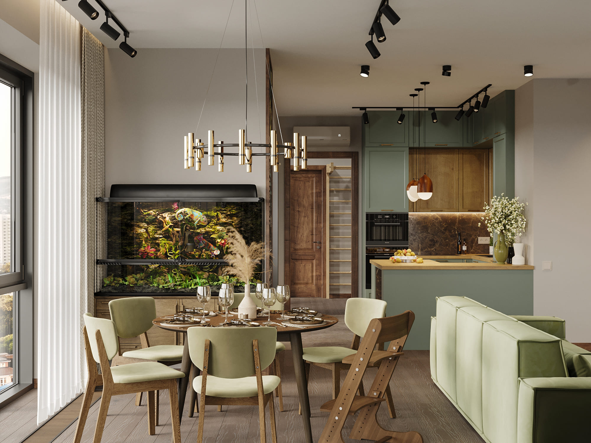 В большой просторной кухне-гостиной мы зонировали пространство, выделив уютную зону отдыха с диваном и нишей под ТВ. Цветовая палитра построена на контрасте тёплых бежевых тонов и нежного акцентного зелёного цвета, а натуральные материалы под дерево добавляют уюта. Для каждой зоны продуманы различные сценарии освещения, в том числе уютная подсветка по периметру потолка вдоль окон. Здесь же расположили большой аквариум для эублефаров.