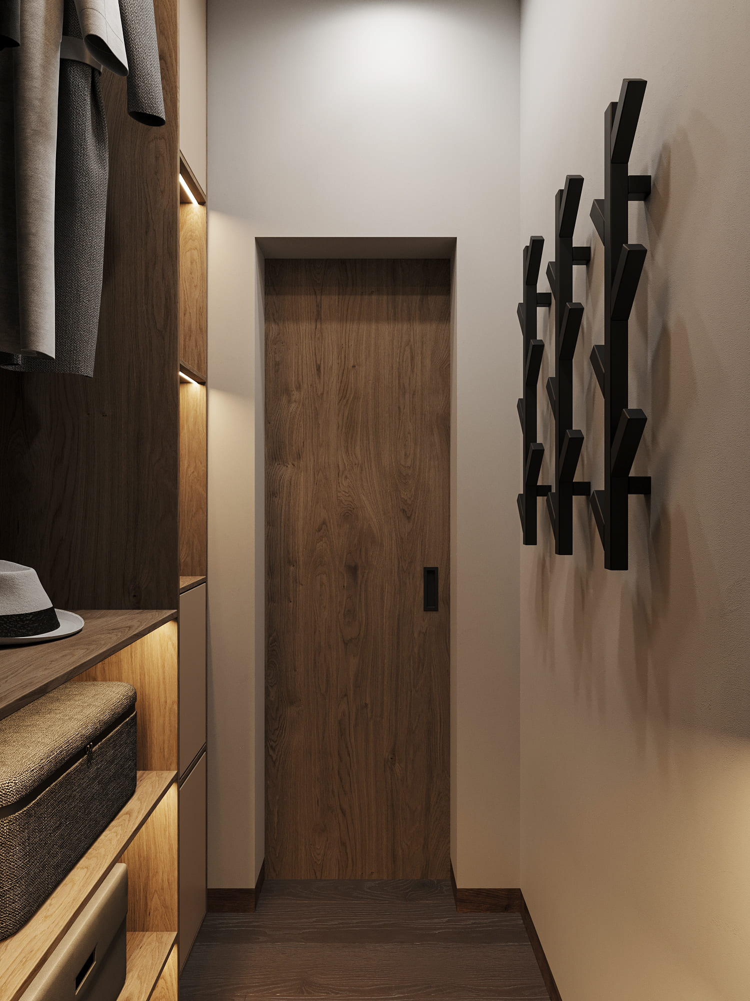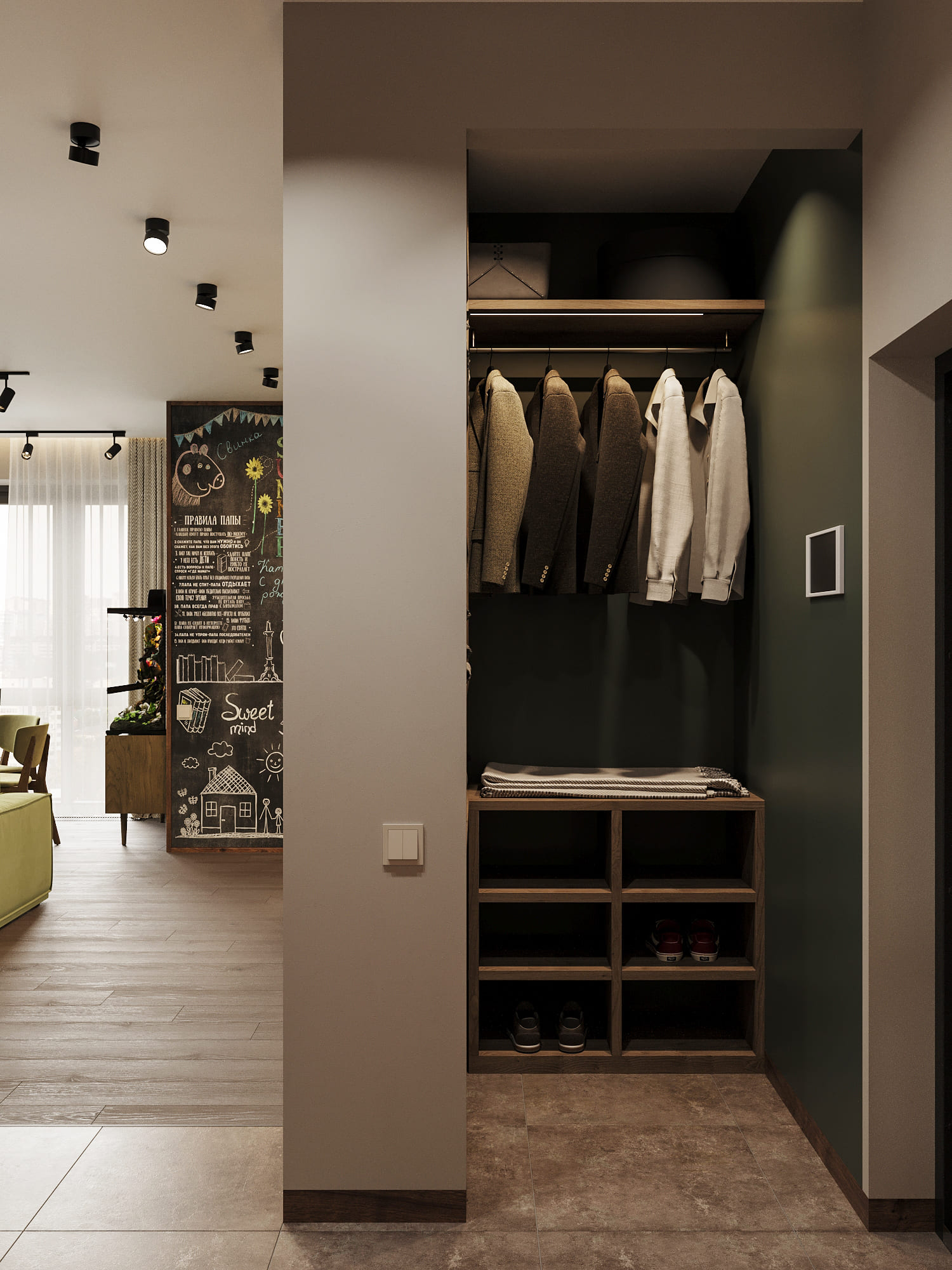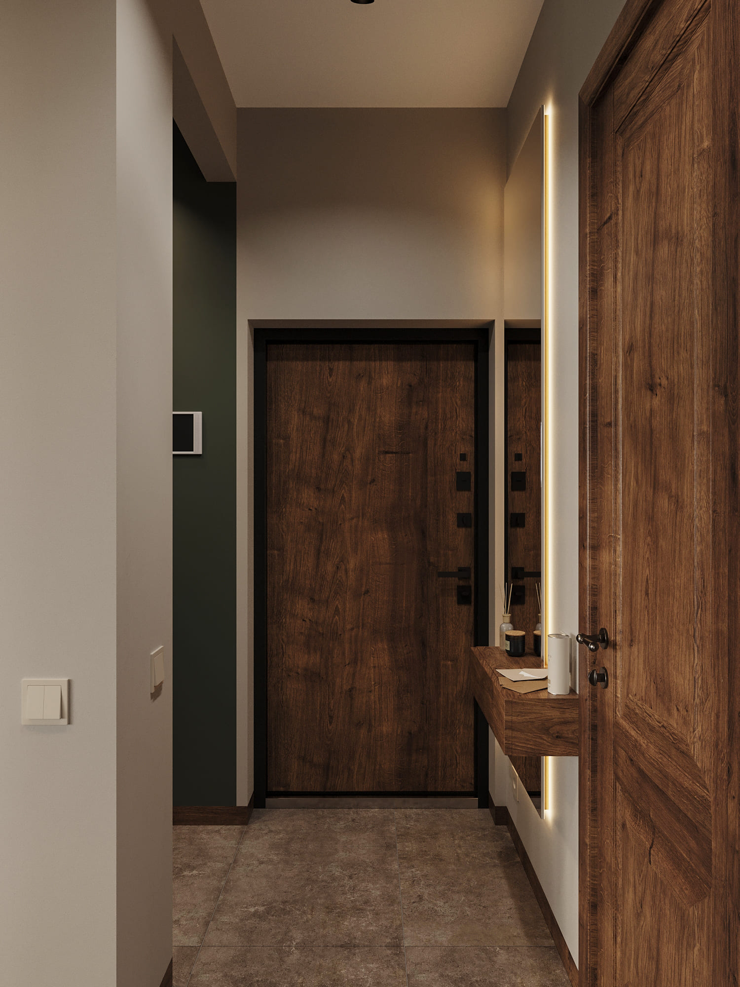 Прихожая оформлена в элегантной контрастной гамме, глубоким зеленым цветом стен выделили гардеробную зону с быстрым доступом к необходимым вещам. Для функциональности здесь разместили большое настенное зеркало, которое зрительно расширяет пространство, и узкую тумбу для мелочей. Дверь слева от входной ведет в техническое помещение, в данном интерьере там расположили постирочную и сушильную зоны.