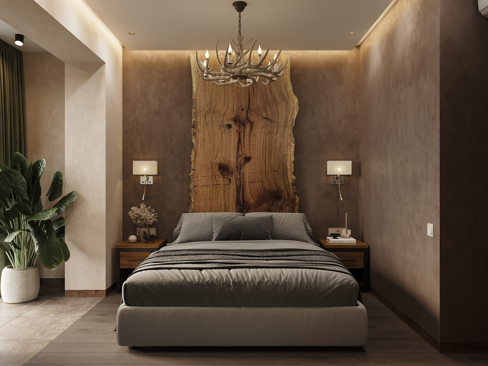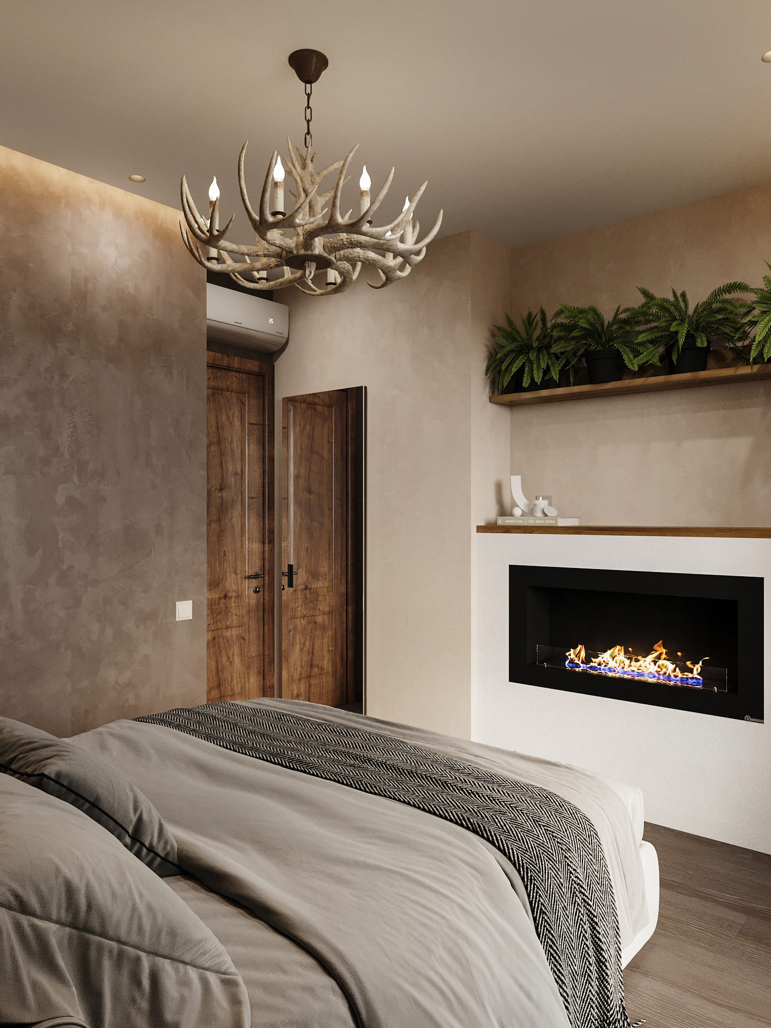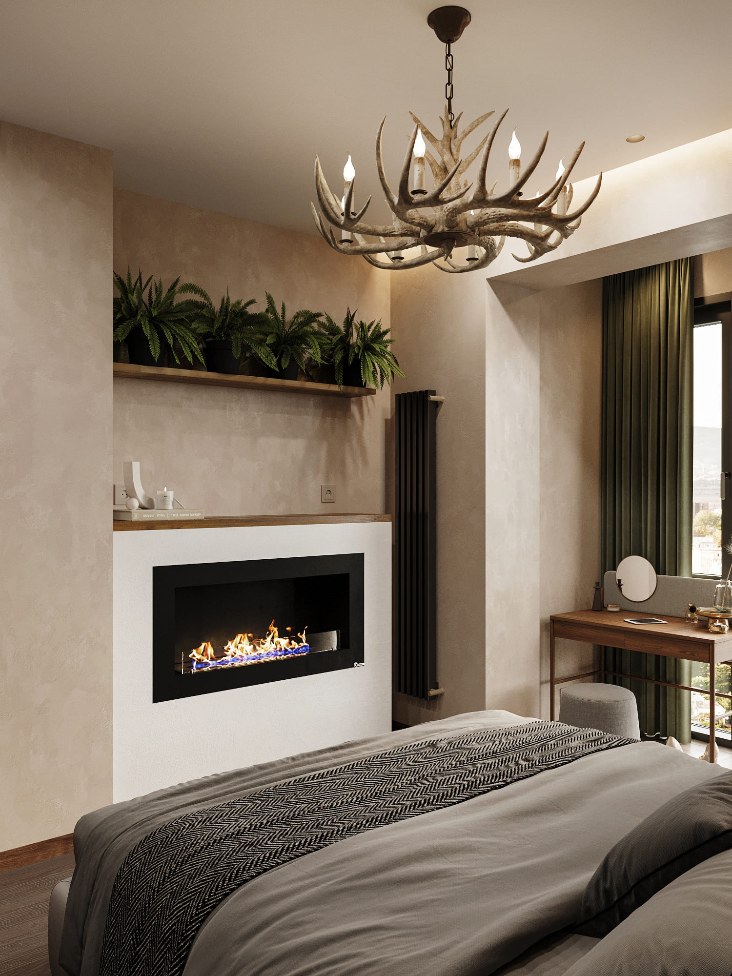 Шикарная мастер-спальня содержит все важные для заказчиков детали - спокойный оттенок в отделке стен, зеленые акценты в виде штор и растений, функциональный туалетный столик, биокамин и акцентное декорирование стены из слэба дерева. Изюминкой в этой комнате стала подвесная люстра имитирующая рога оленя.