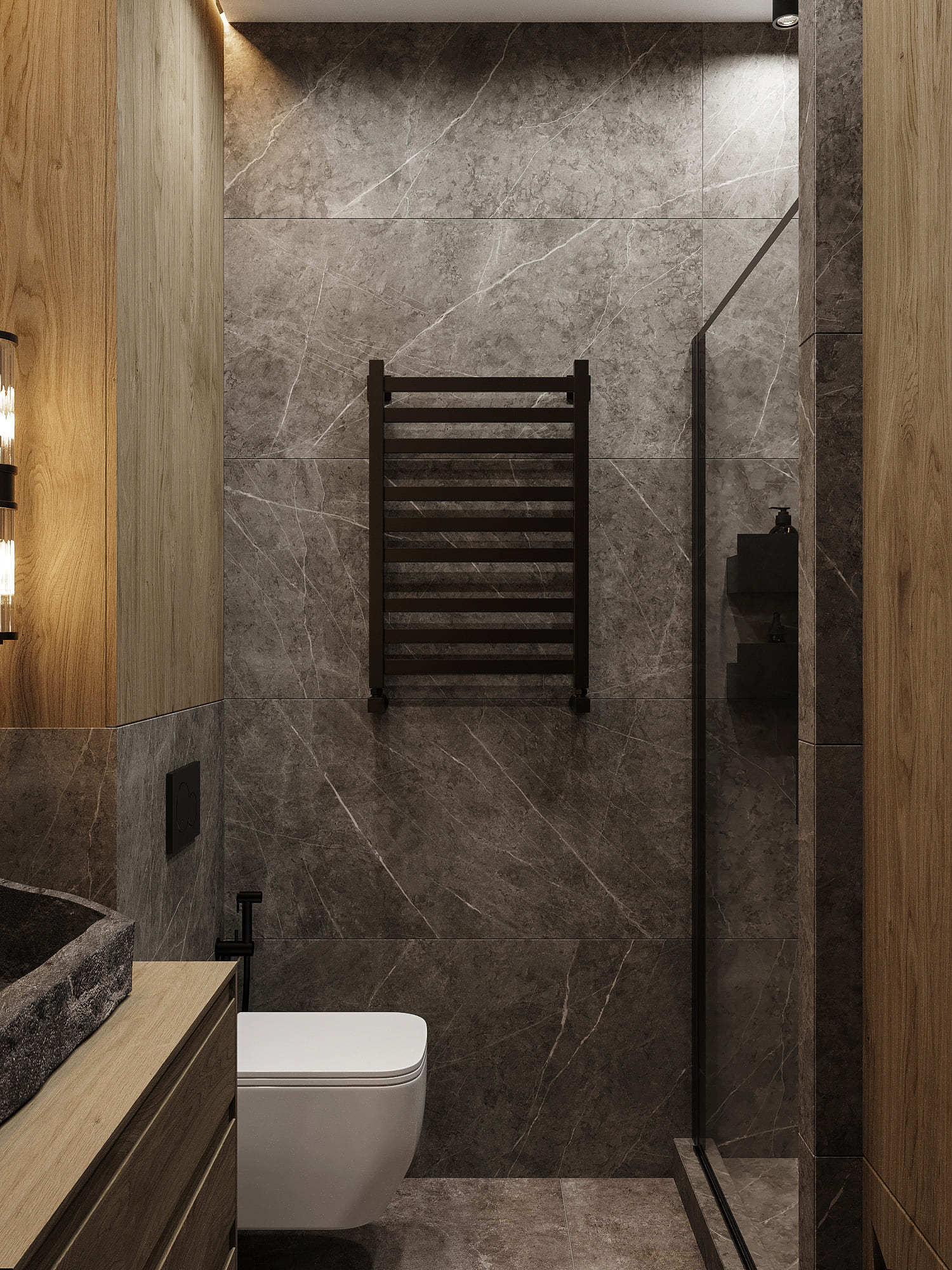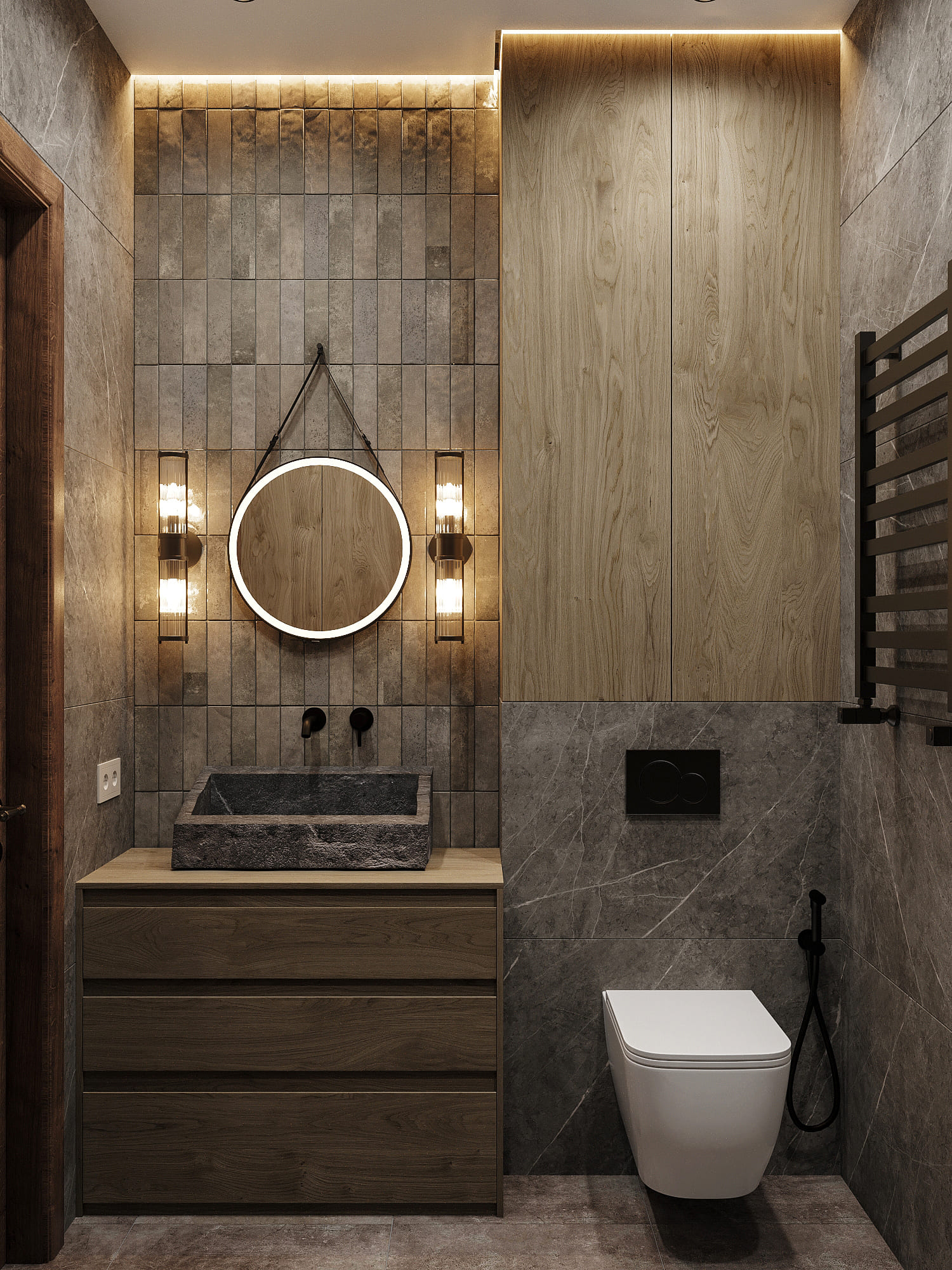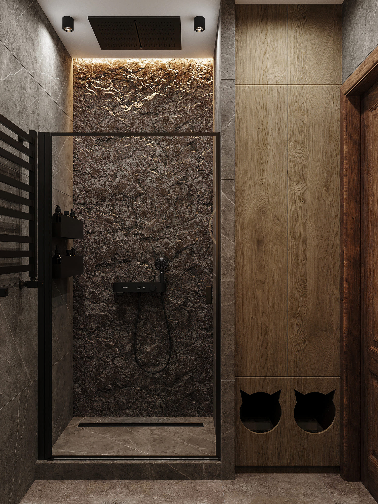 В санузлах одним из главных пожеланий заказчиков было разместить имитацию скалы. В первом санузле расположили данную имитацию в душевой зоне, а также продолжили стилистическую идею в виде каменной раковины. Общая цветовая концепция выдержана в серо-коричневых оттенках; полки для хранения выбрали закрытого типа - и над инсталляцией, и под раковиной. Таким образом сохраняется ощущение чистоты и порядка.